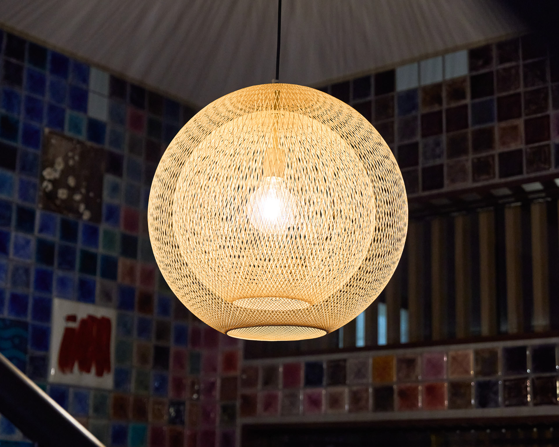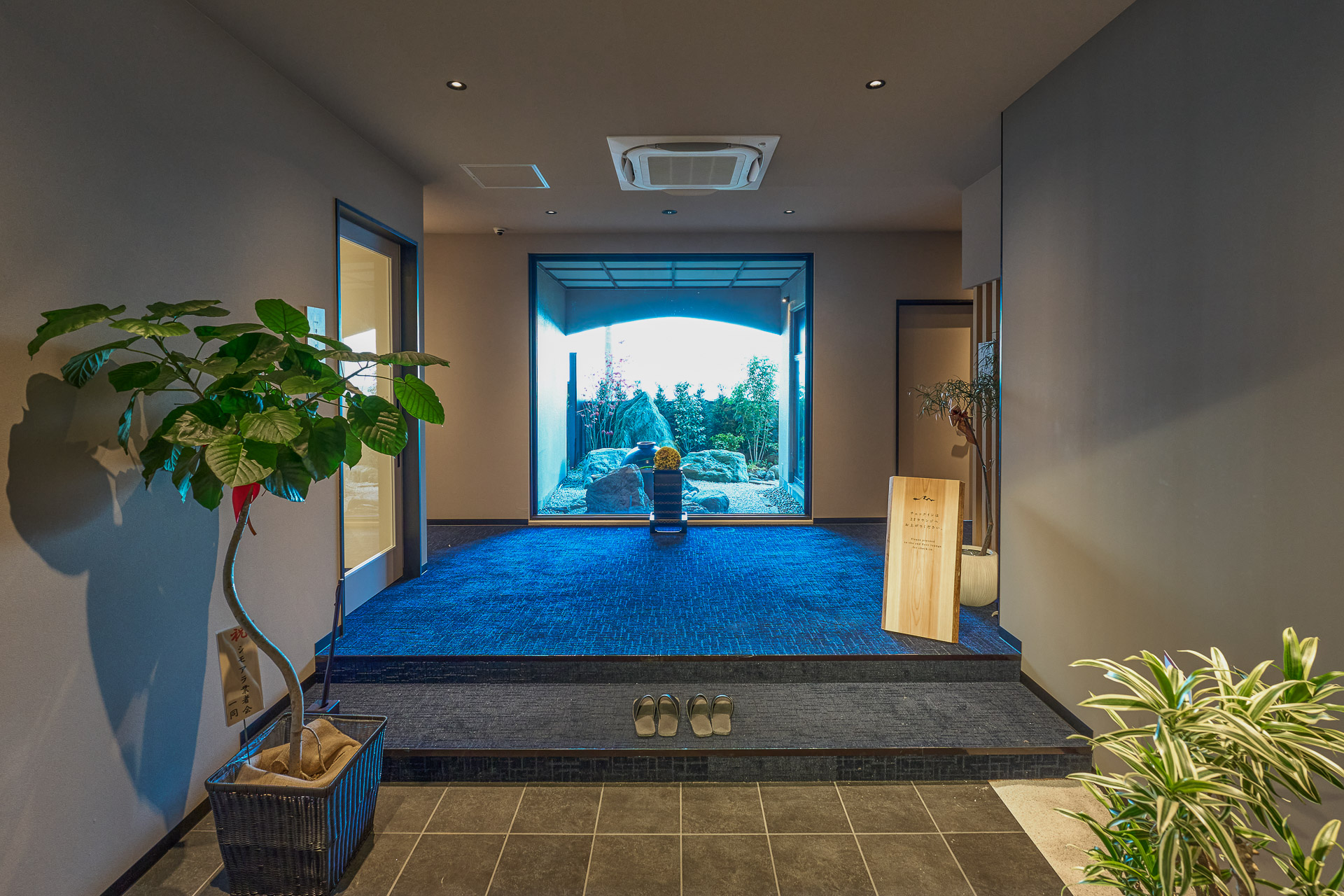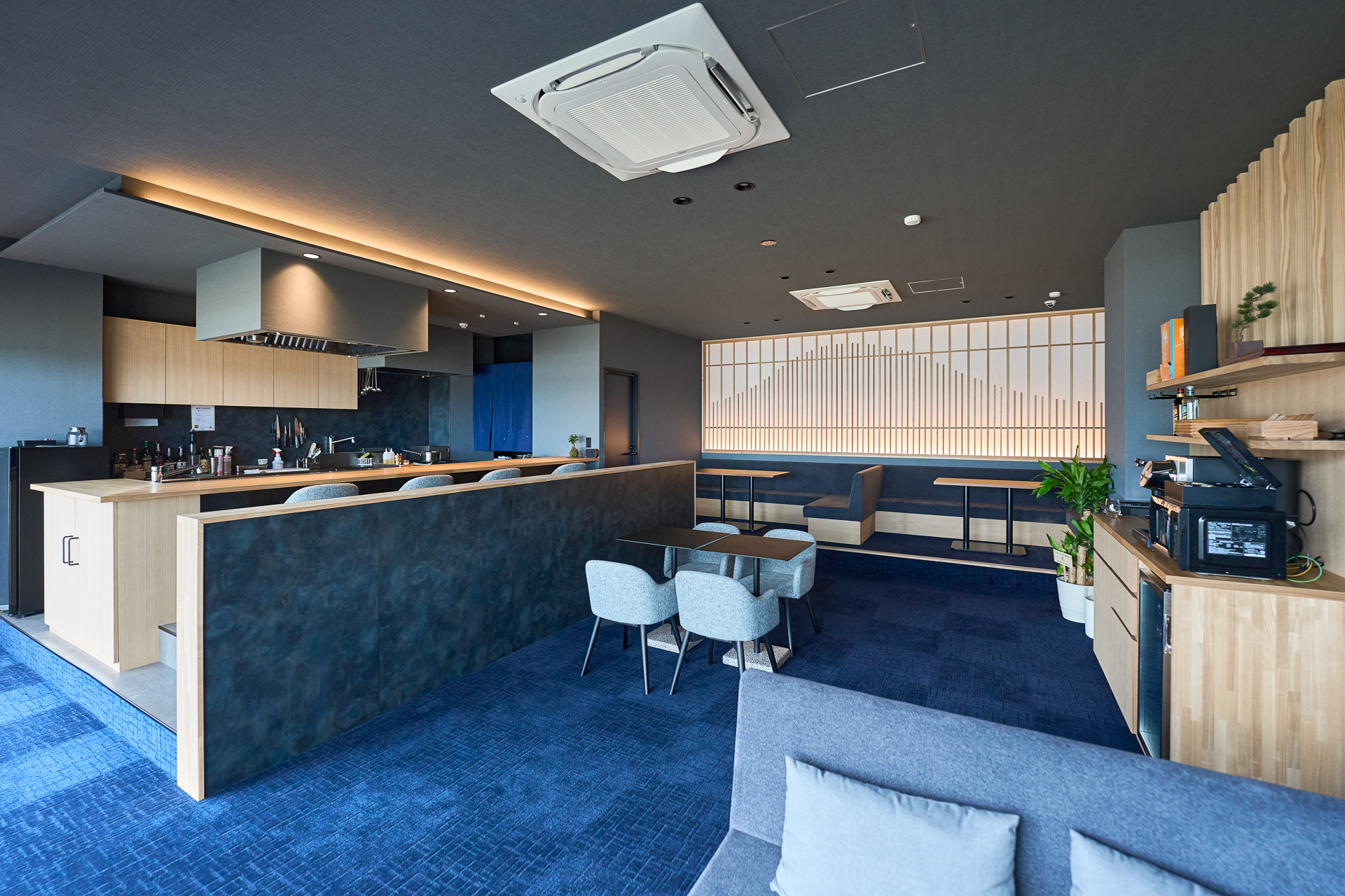 ラウンジは、波を表現した障子が優しく光り、深い海の中をイメージさせる落ち着いた空間。