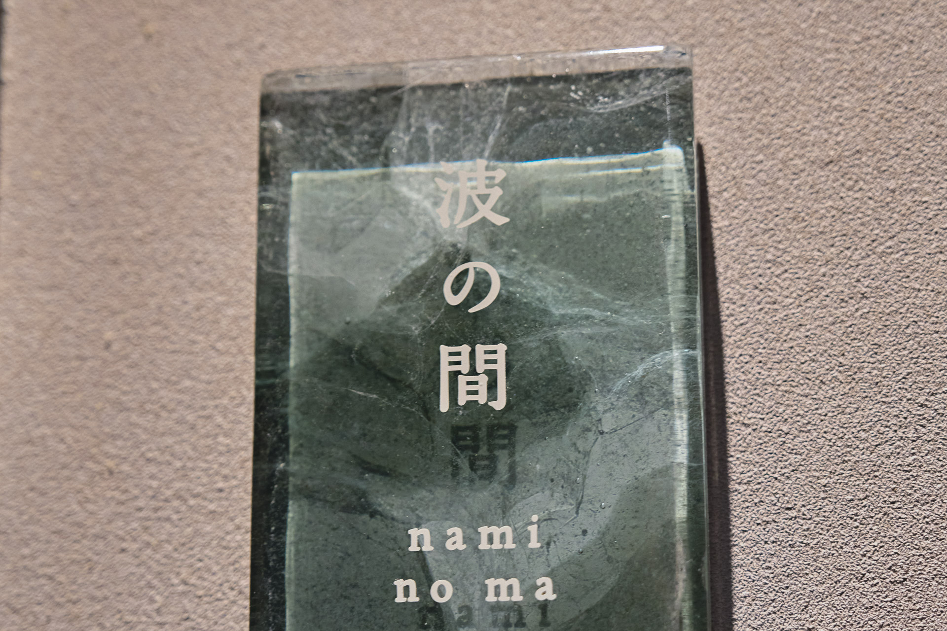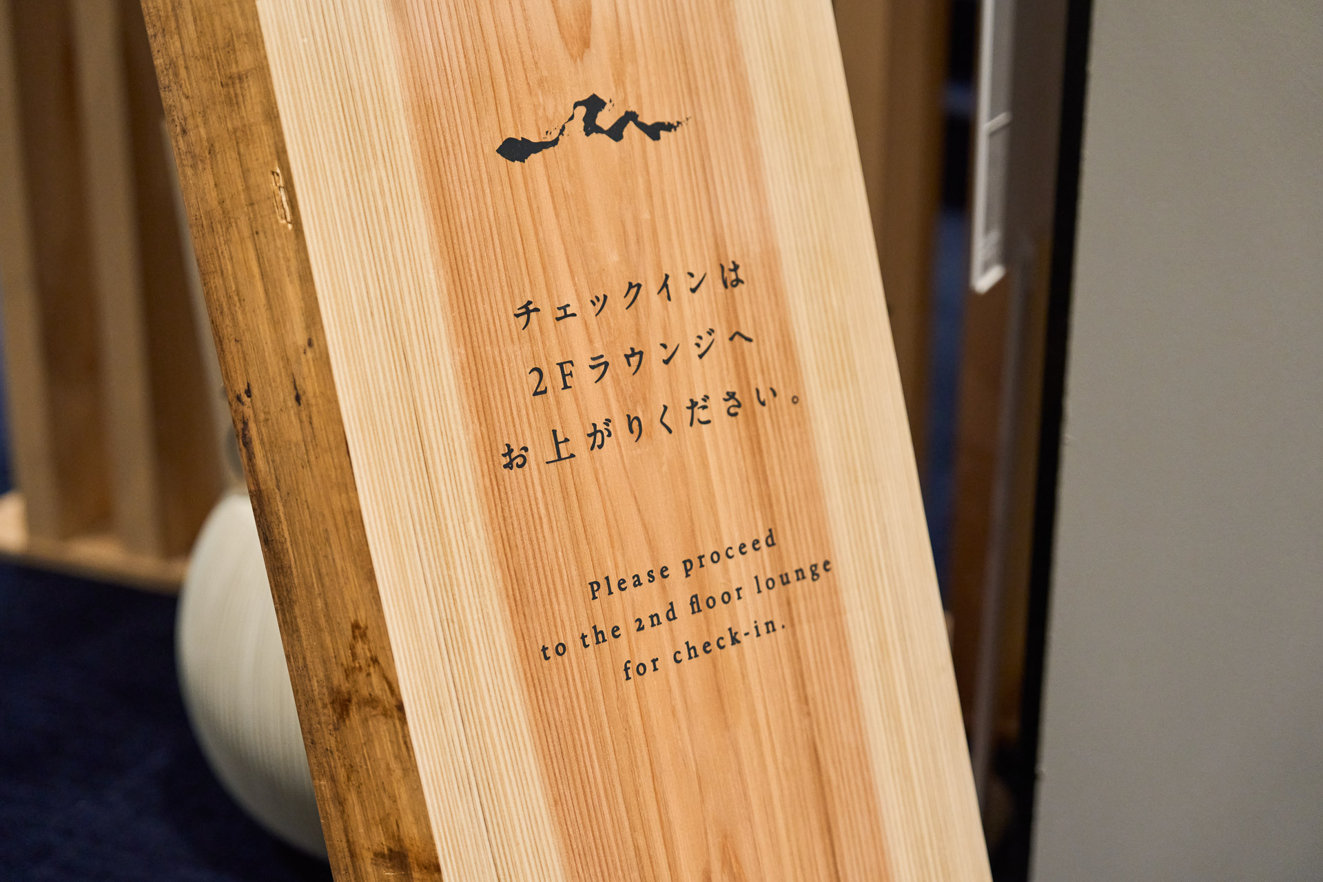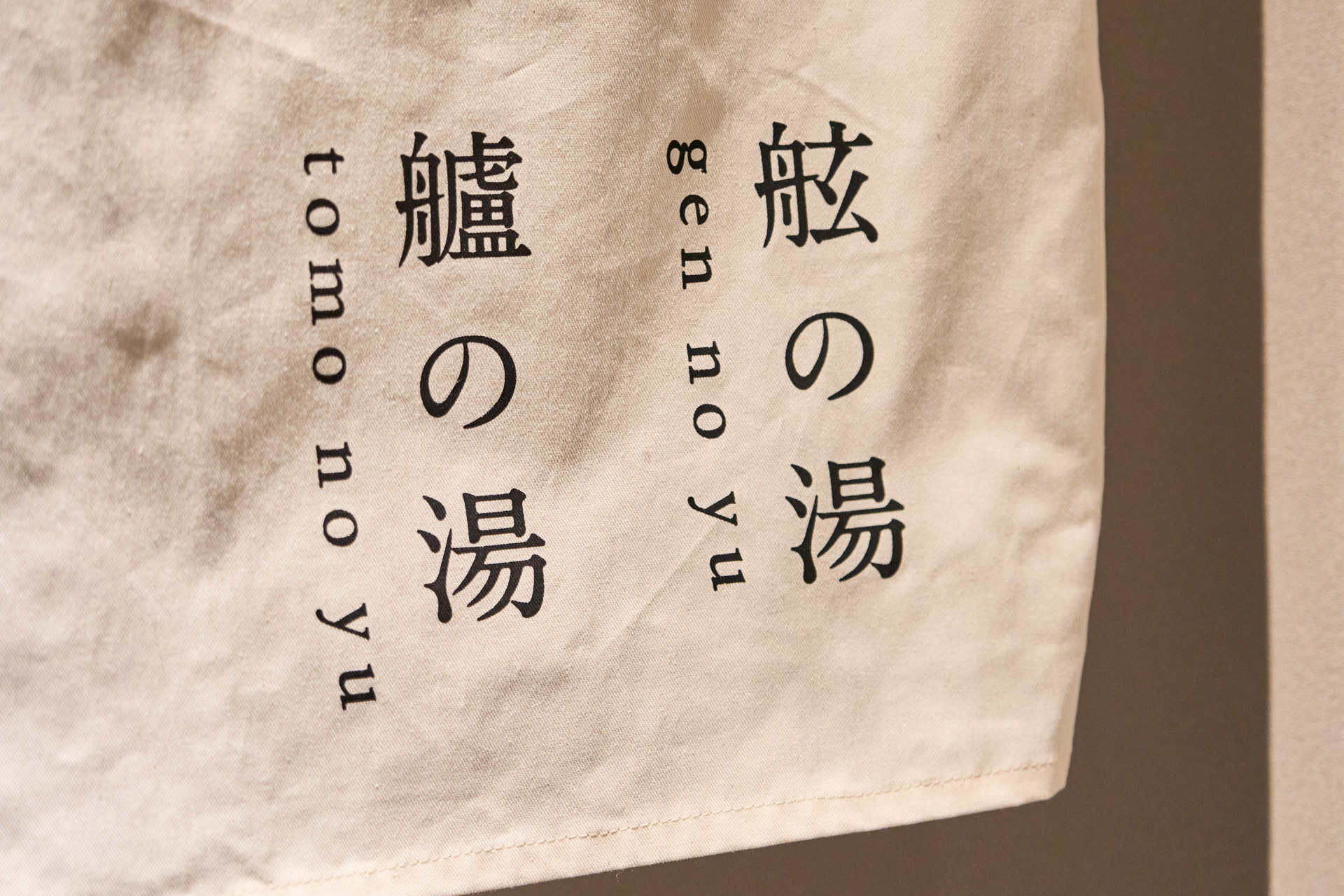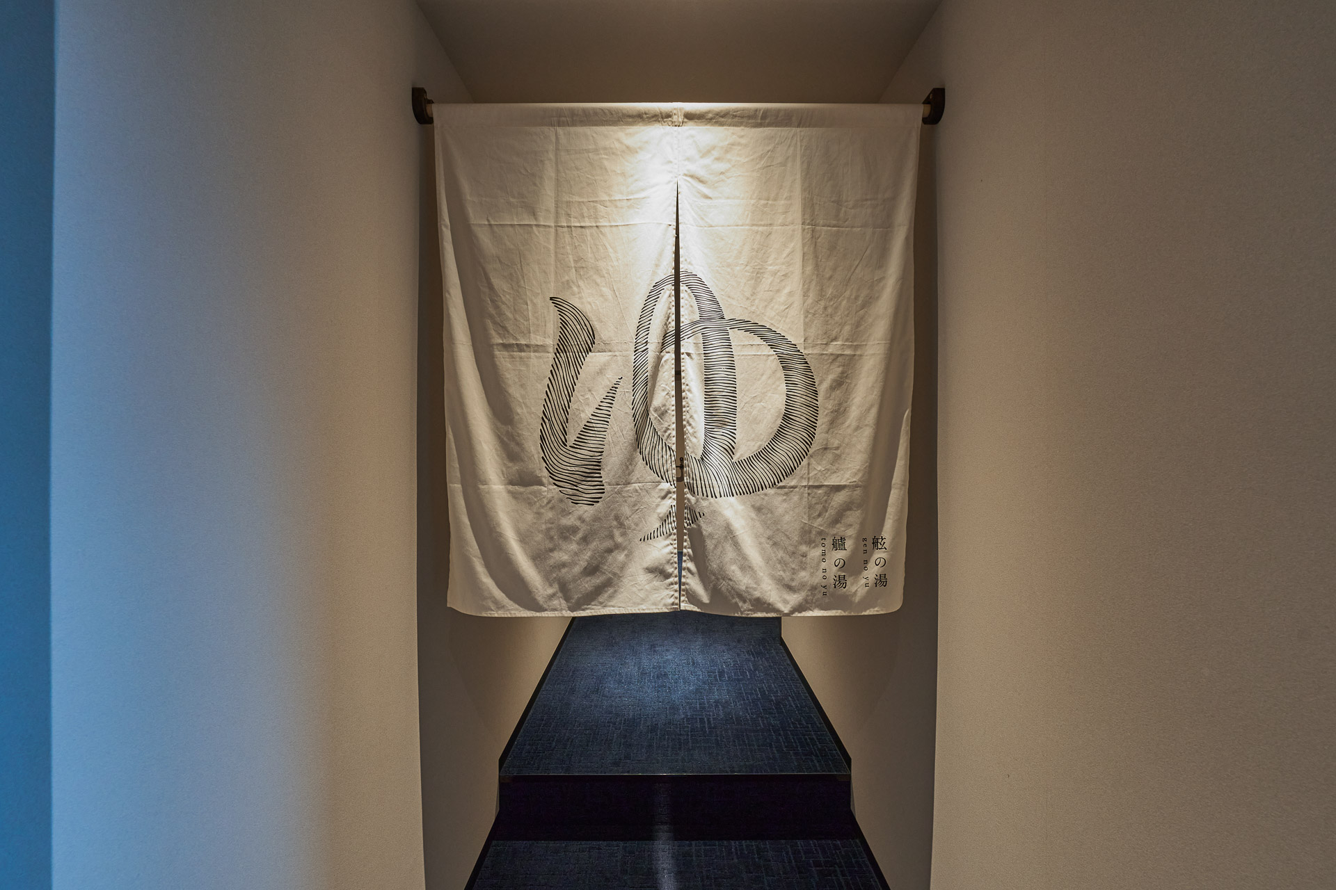 貸切風呂の入り口は、人の温かみを感じさせる揺らぎのある線で構成したサイン「ゆ」。