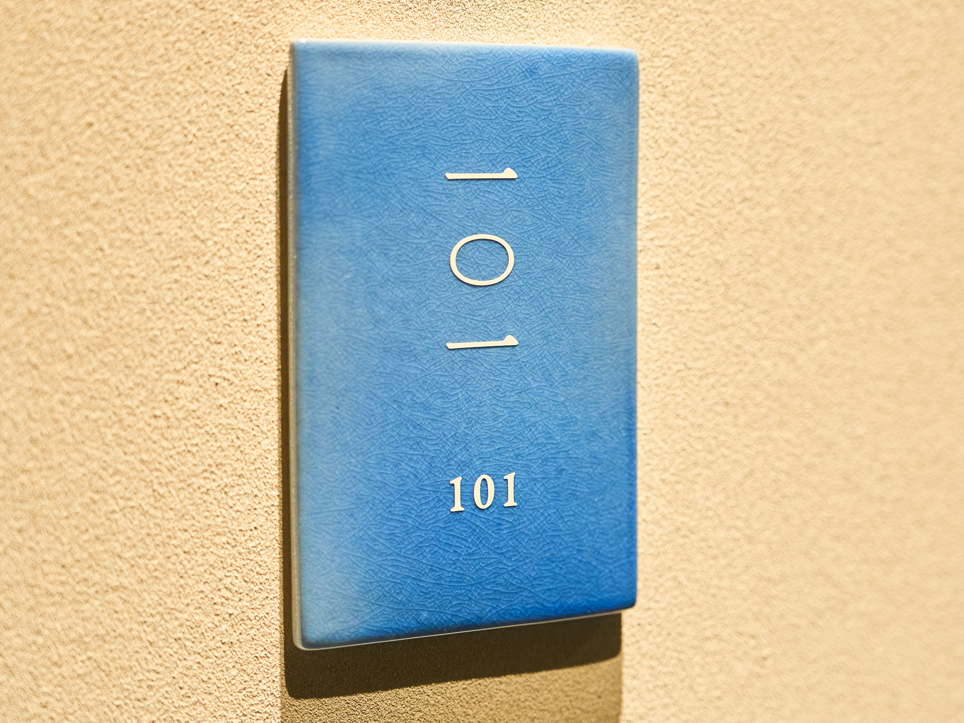 スタンダードルームの表札は釉薬の揺らぎが美しい九谷焼。