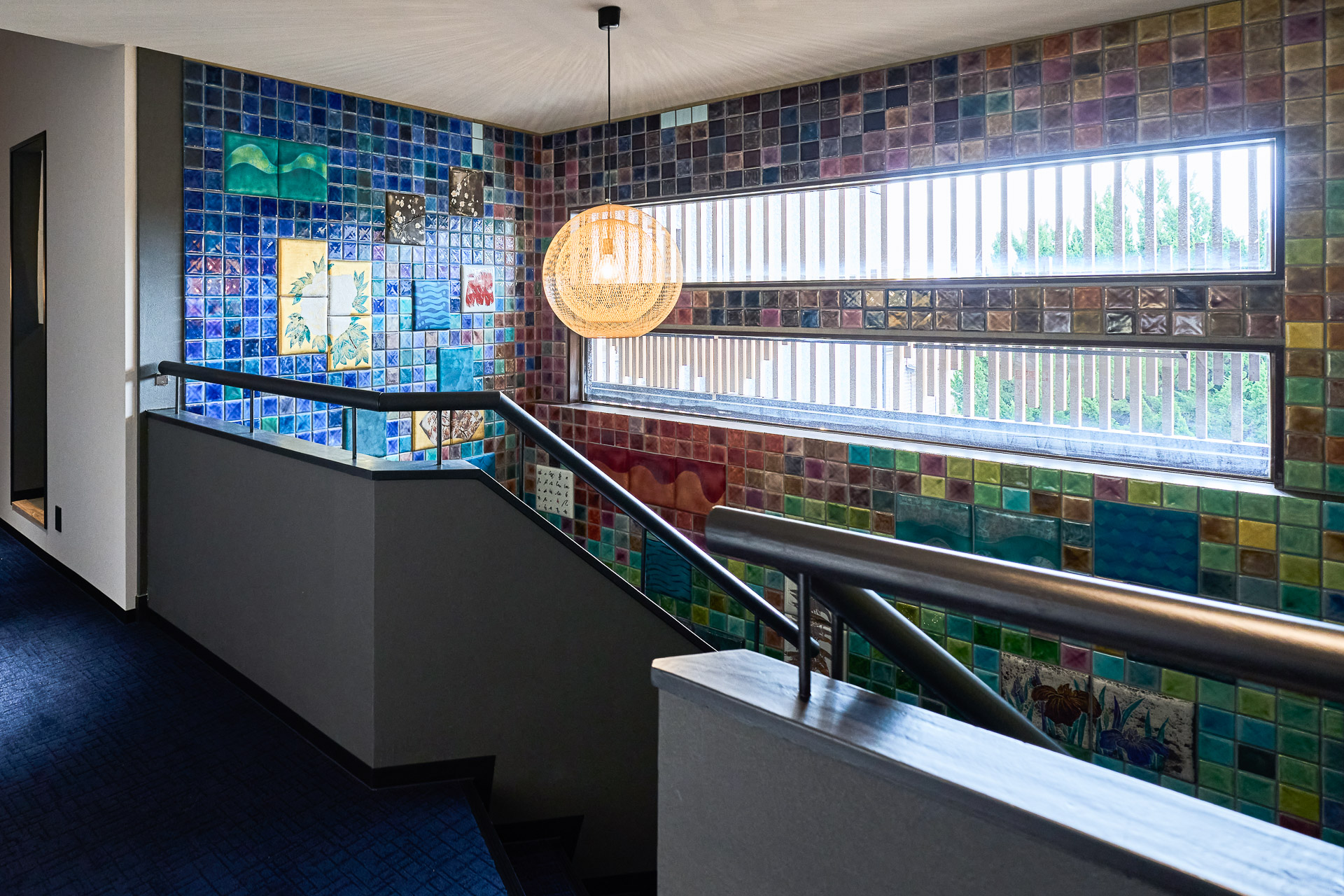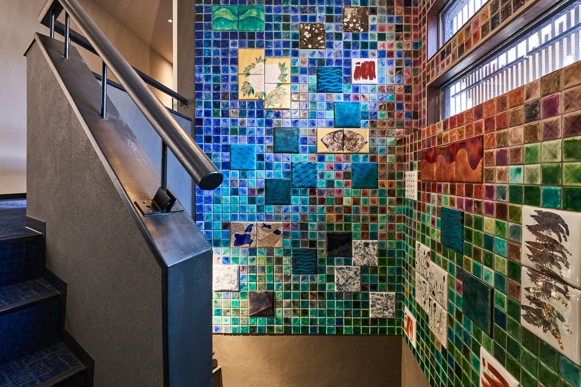 階段ホールは旧料亭の設えそのままに、色鮮やかな九谷焼のタイルで彩られています。