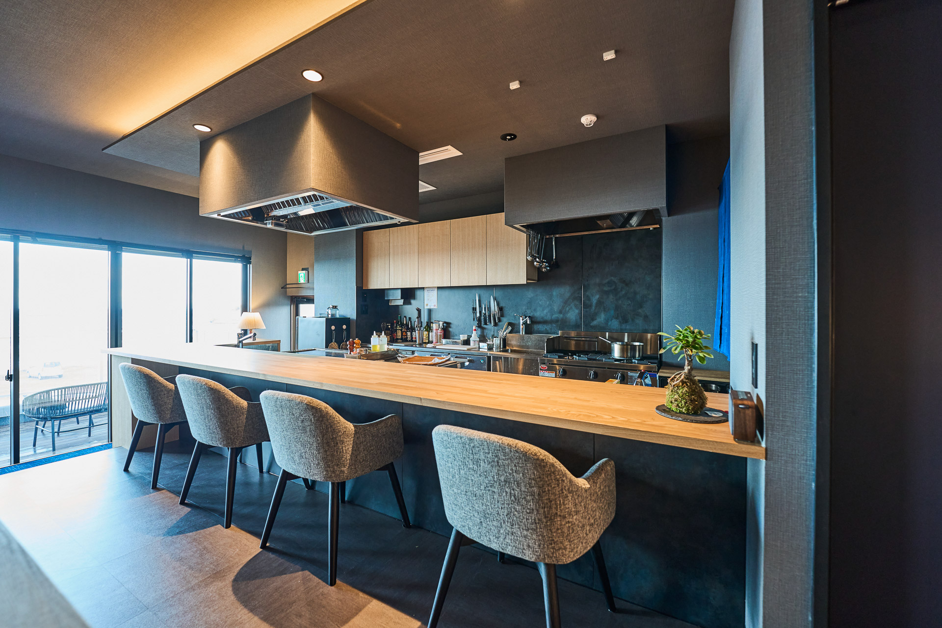 海に面した窓が開放感ある浴室や、ダークカラーで落ち着いた寝室、ダイニングテーブルも備え、長期滞在にもおすすめです。