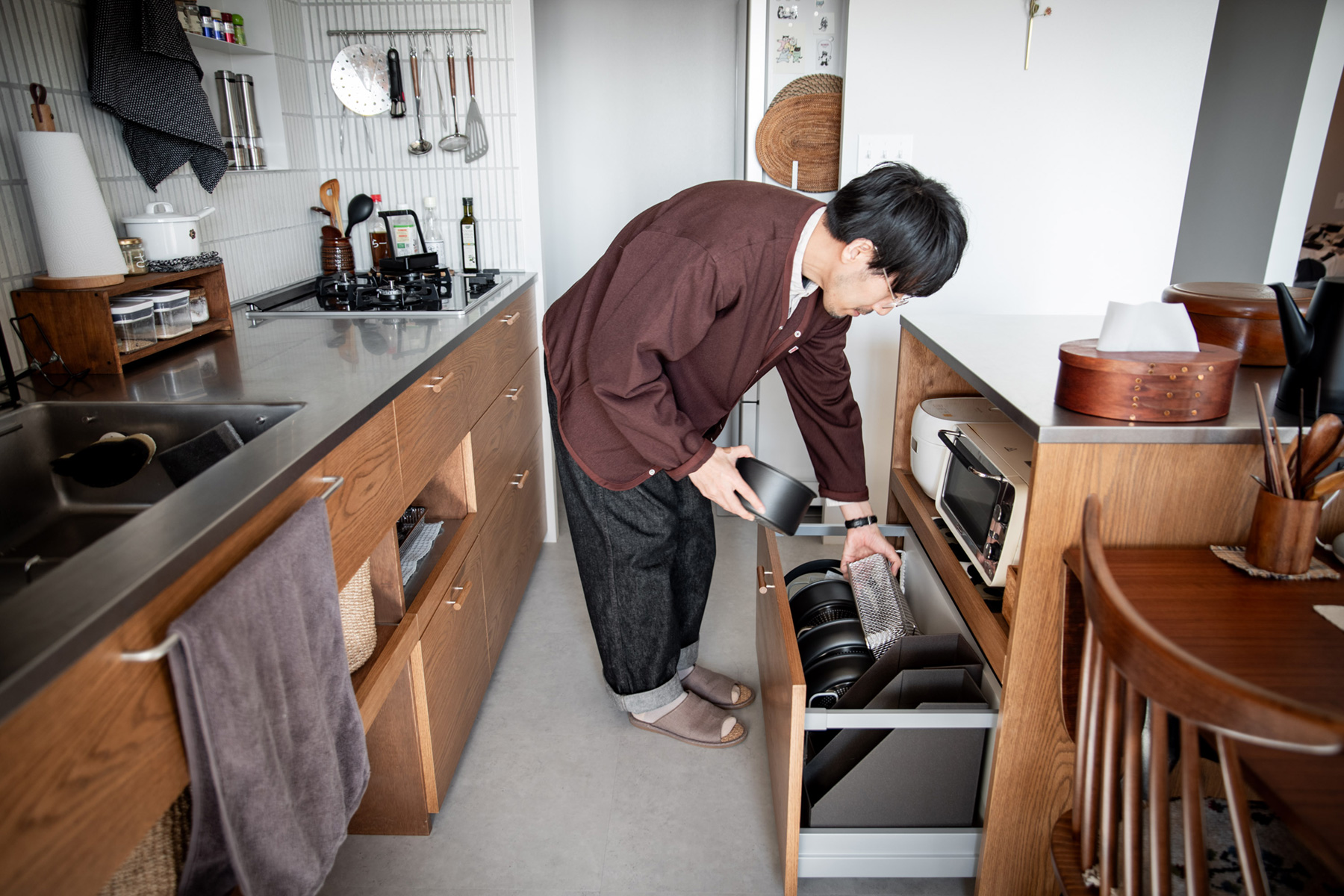「食洗機はメンテナンスが大変そうだなと思い導入しなかったのですが、その代わりに作ってもらった水切りかごを置く専用スペースが本当に便利。夜に洗った食器をそのまま置いておけるので、朝の忙しい時間がぐっとラクになります。食洗機がない我が家には欠かせない機能です」