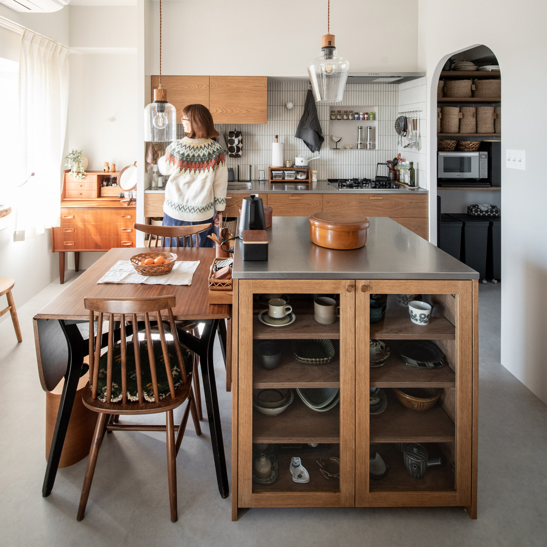 「作家さんの器が好きで集めているので、それを飾りながら収納できる作業台もお気に入り。買い物から帰ってきて荷物を置く場所としても使えるし、見た目もかわいいんです」