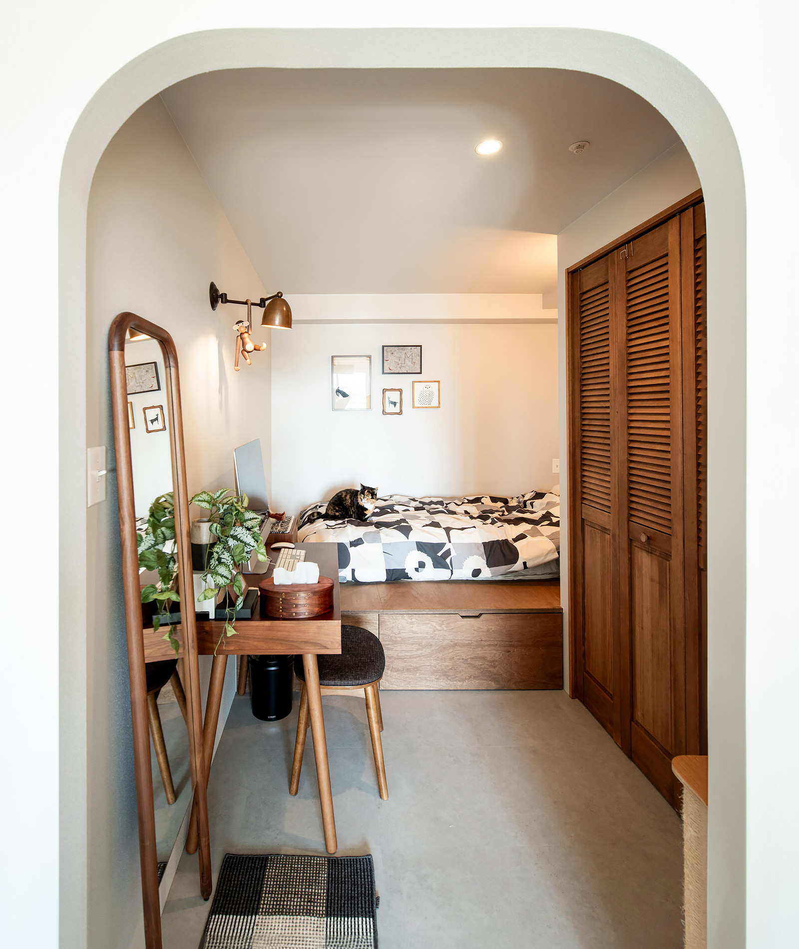 「猫やホコリが入り込まないようにベッド下に空間を作らない設計にしました。下は収納になっていて、とても機能的です」