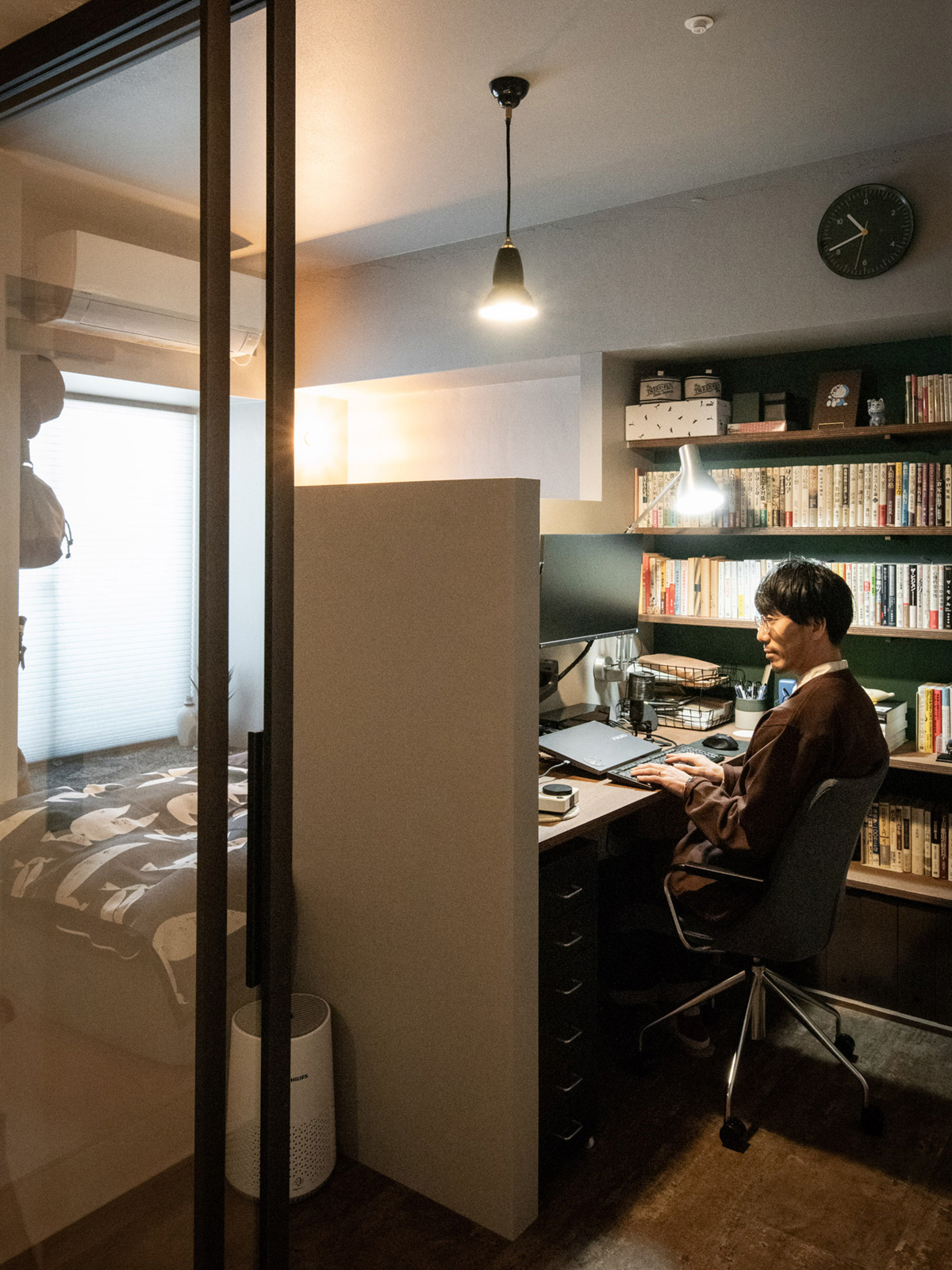 一方、ご主人のワークスペースは、ガラス扉で仕切りながらも猫の気配がわかるように。