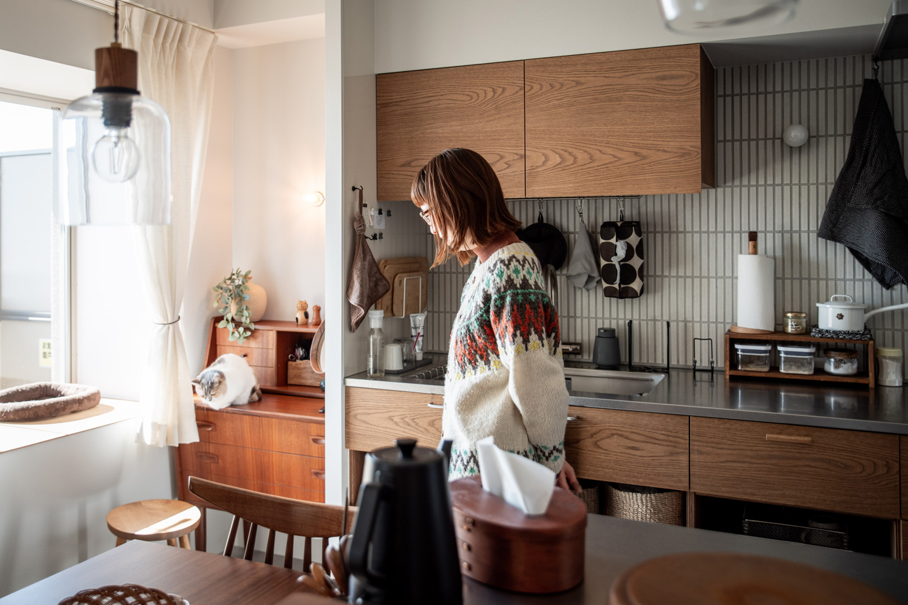 「設計段階でできる限り想像していたけれど、実際に住んで、動いてみないとわからないことってやっぱりあるなと実感しました。たとえばキッチンの壁についていたコンセントは、調味料を置いたら隠れてしまったり。」