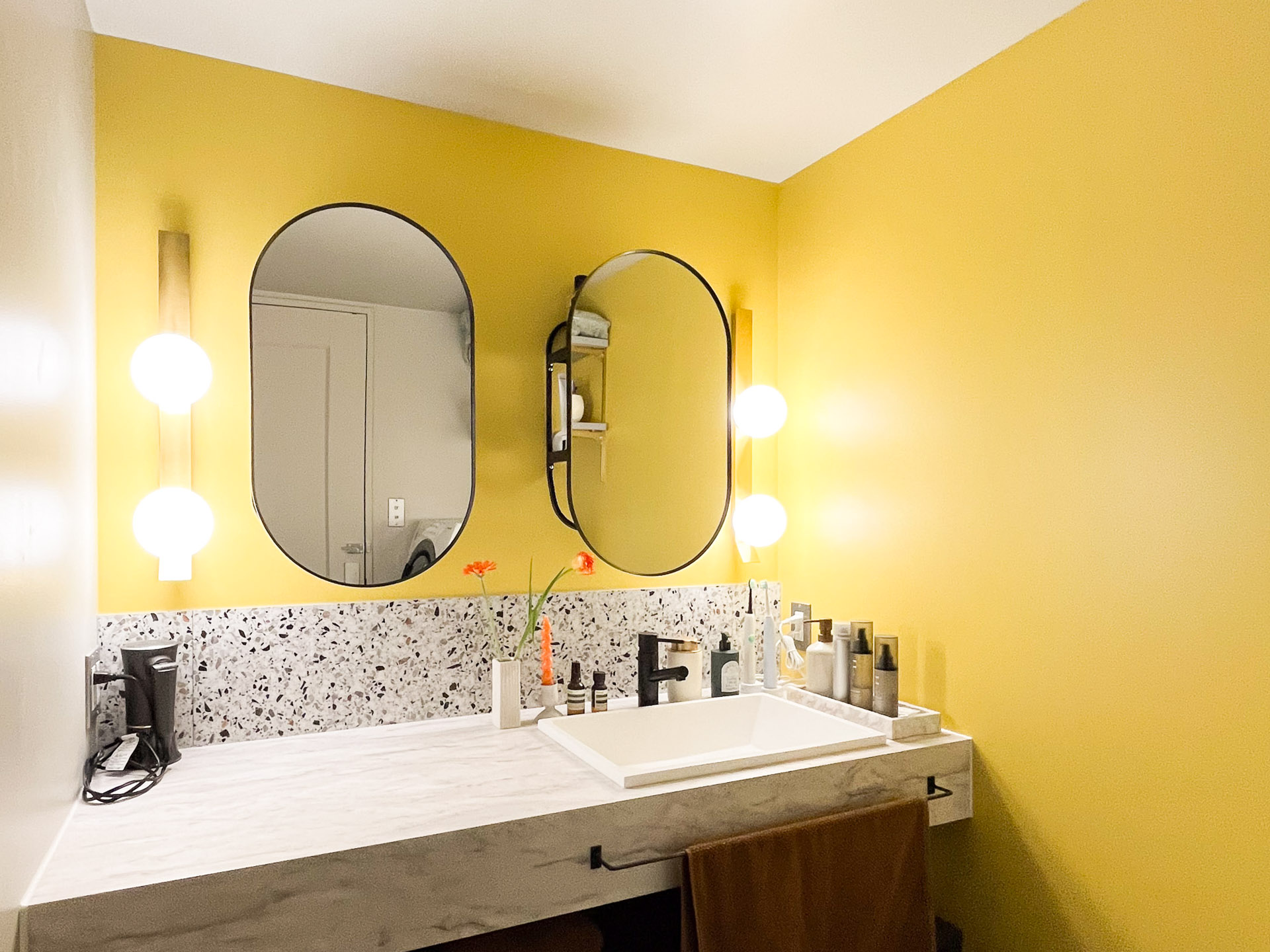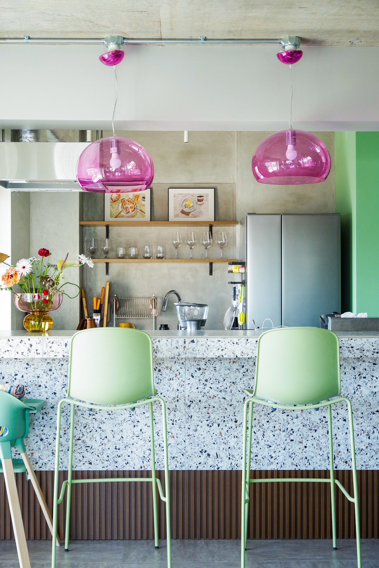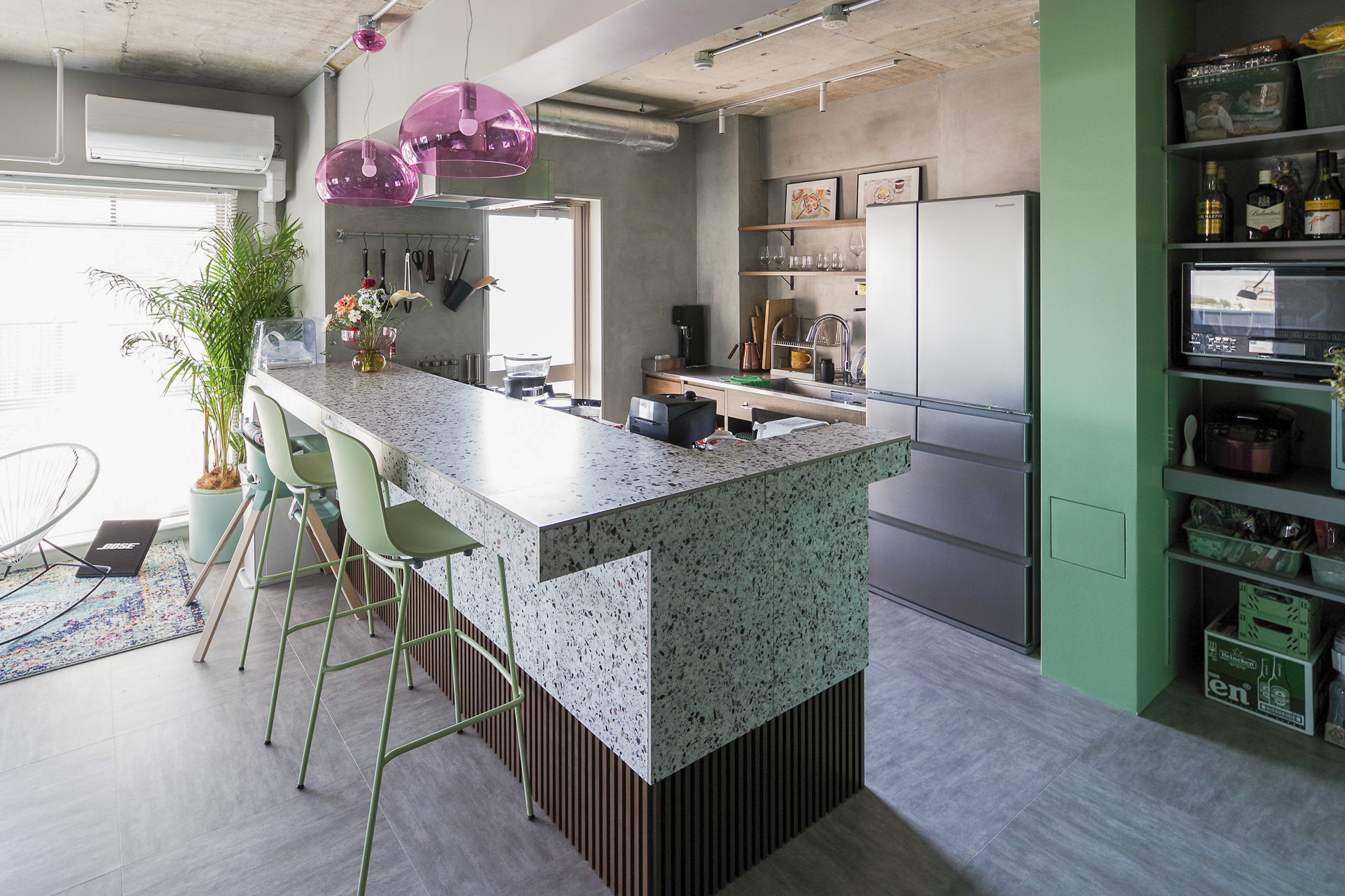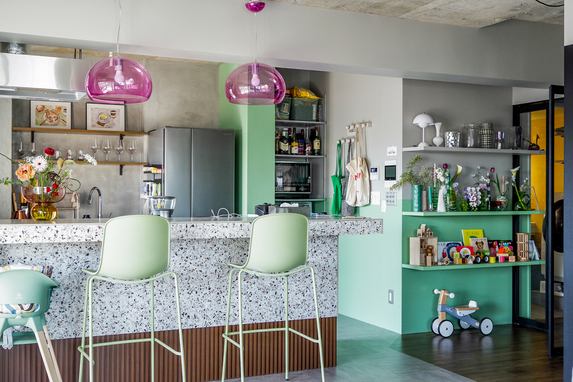 透明感のあるライトが、テラゾーの模様や、トゥーのハイスツールの色とも絶妙にマッチしています。