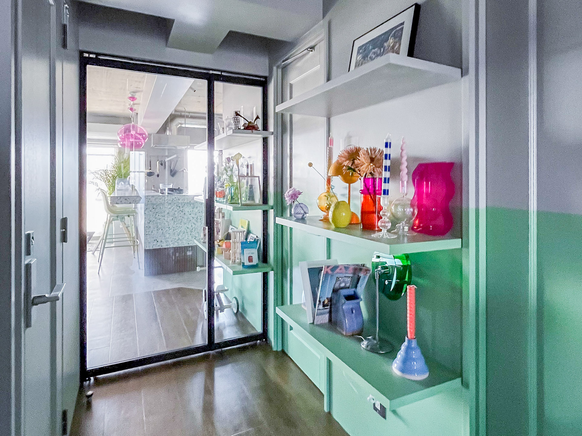 玄関から続く廊下には、壁一面の飾り棚を造作。「ディスプレイする」ということを最優先に、棚受けが見えない仕様にして、空間をすっきりと見せています。