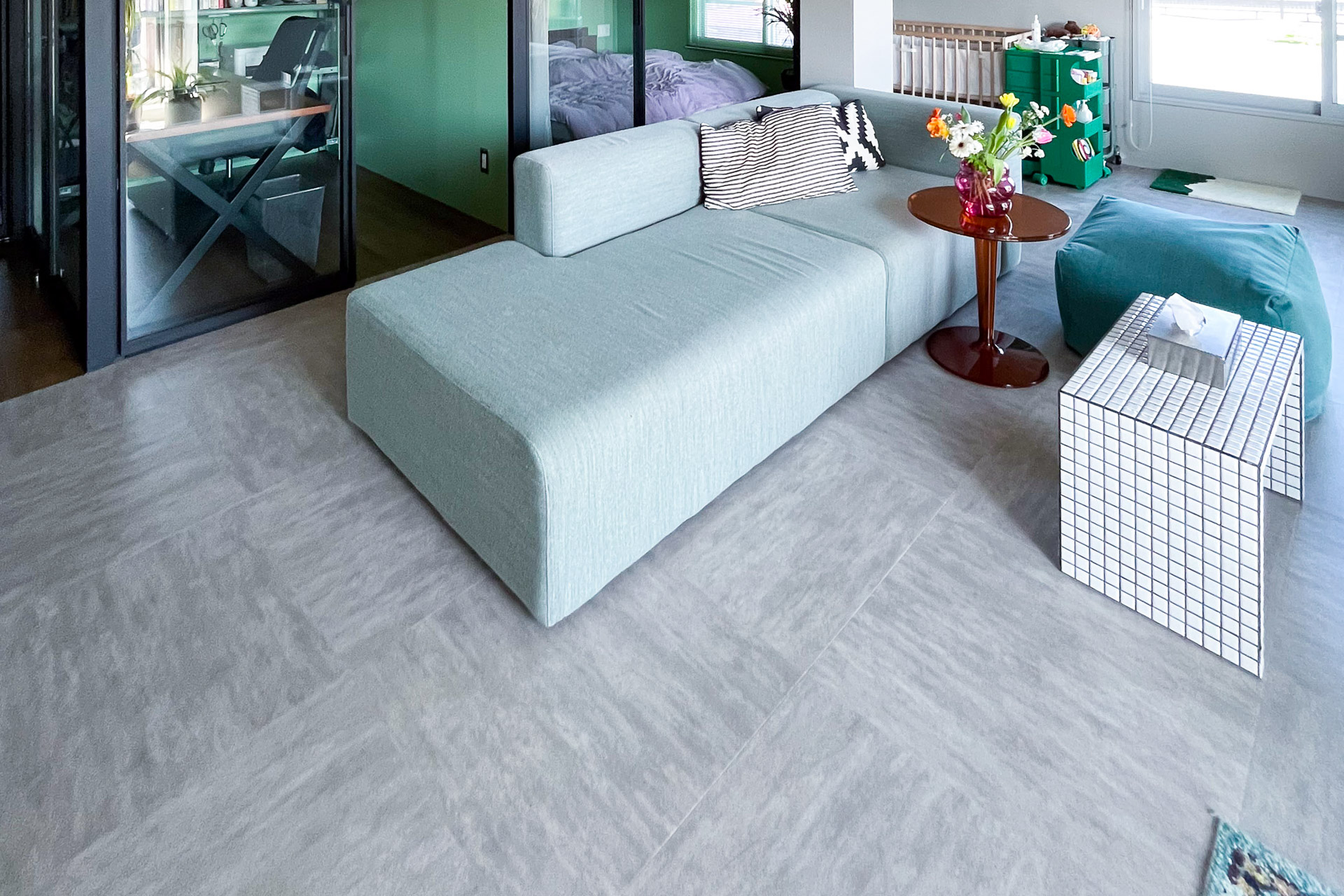 「モルタルの床がいいな、と思っていたけど、冷たさや硬さのデメリットを聞いて、モルタル調の塩ビタイルにしました」とY様。