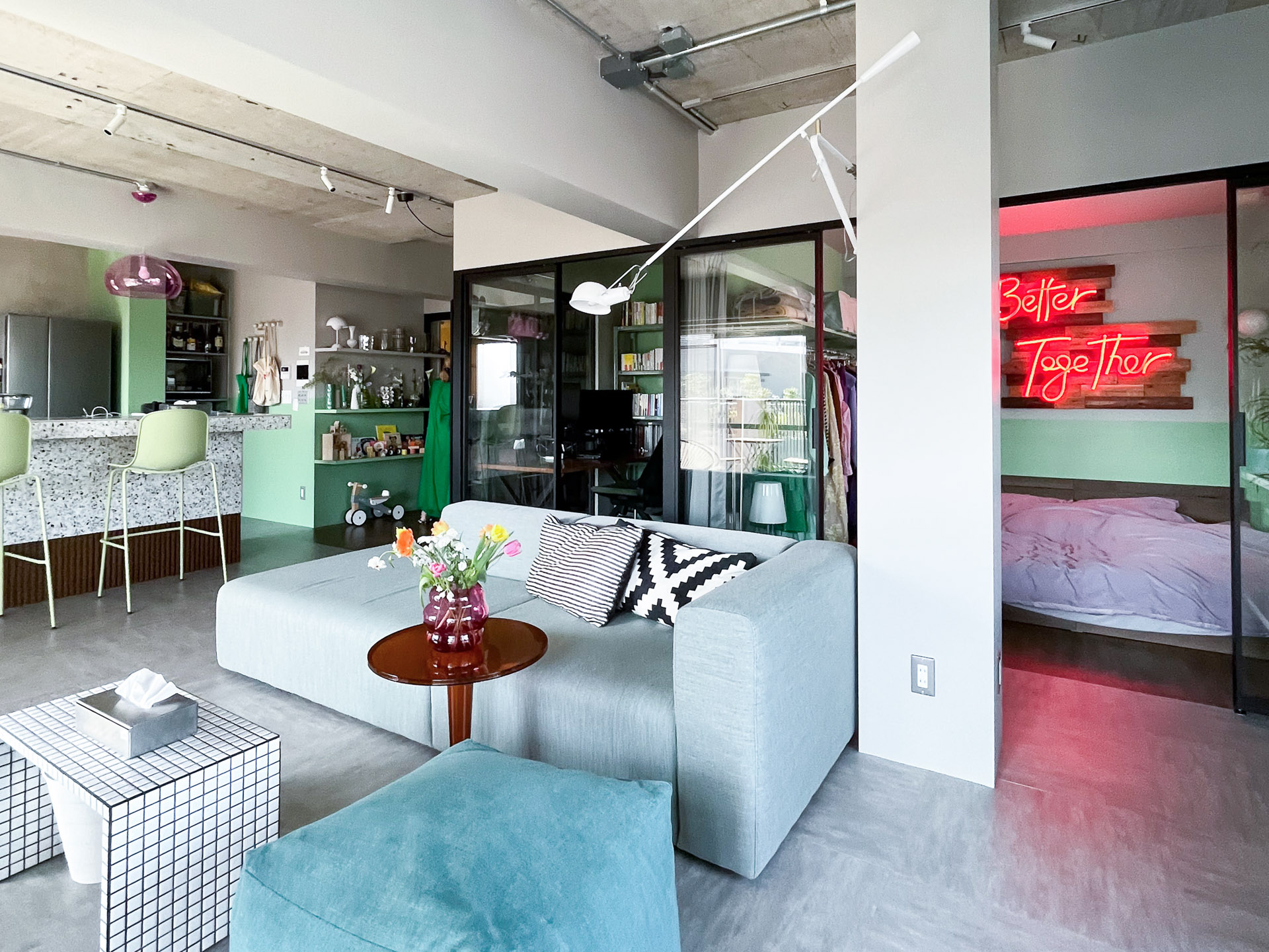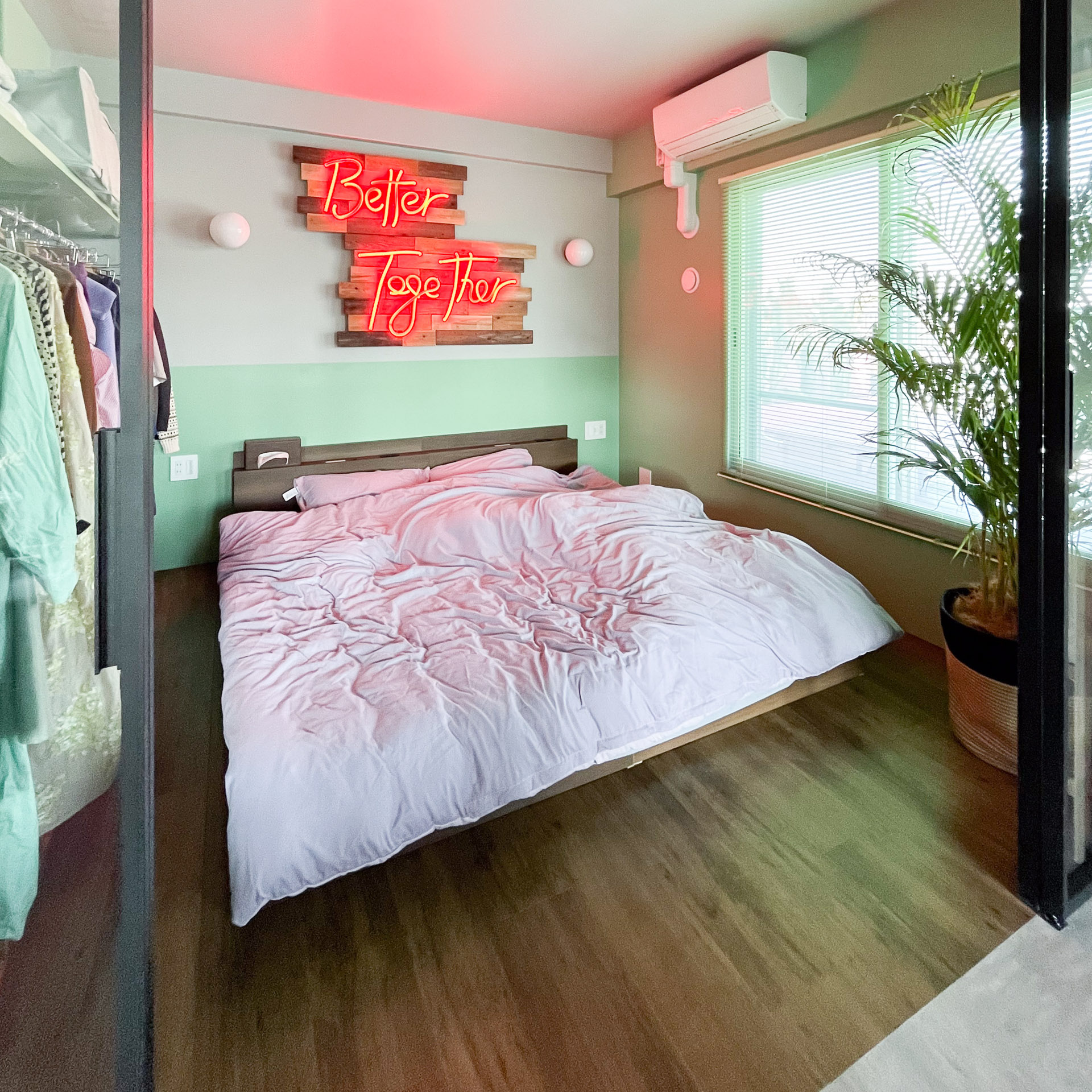 壁のグリーンとの色の相性も抜群ですが、寝室で一番目につくのは、なんと言ってもネオンサインです。