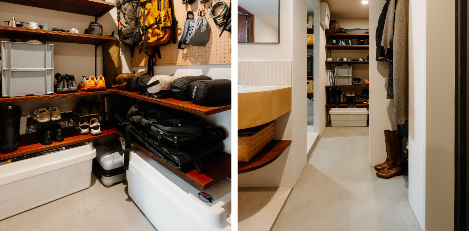 キャンプ道具、趣味のアイテム、外で使うものはすべて土間に集約。