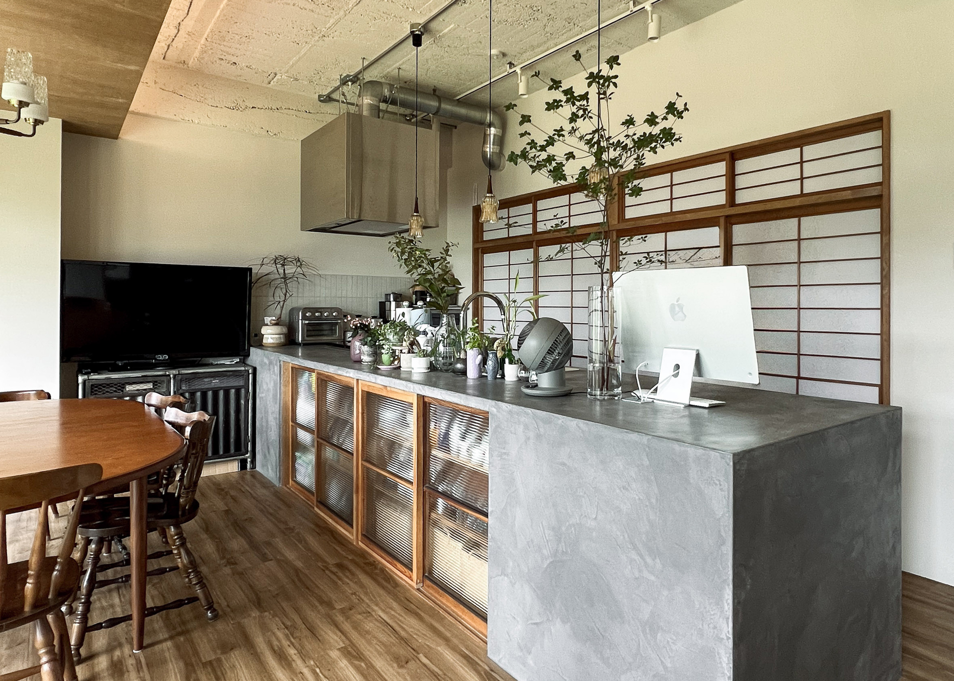 キッチンカウンターはニュアンスのあるモールテックス仕上げ。