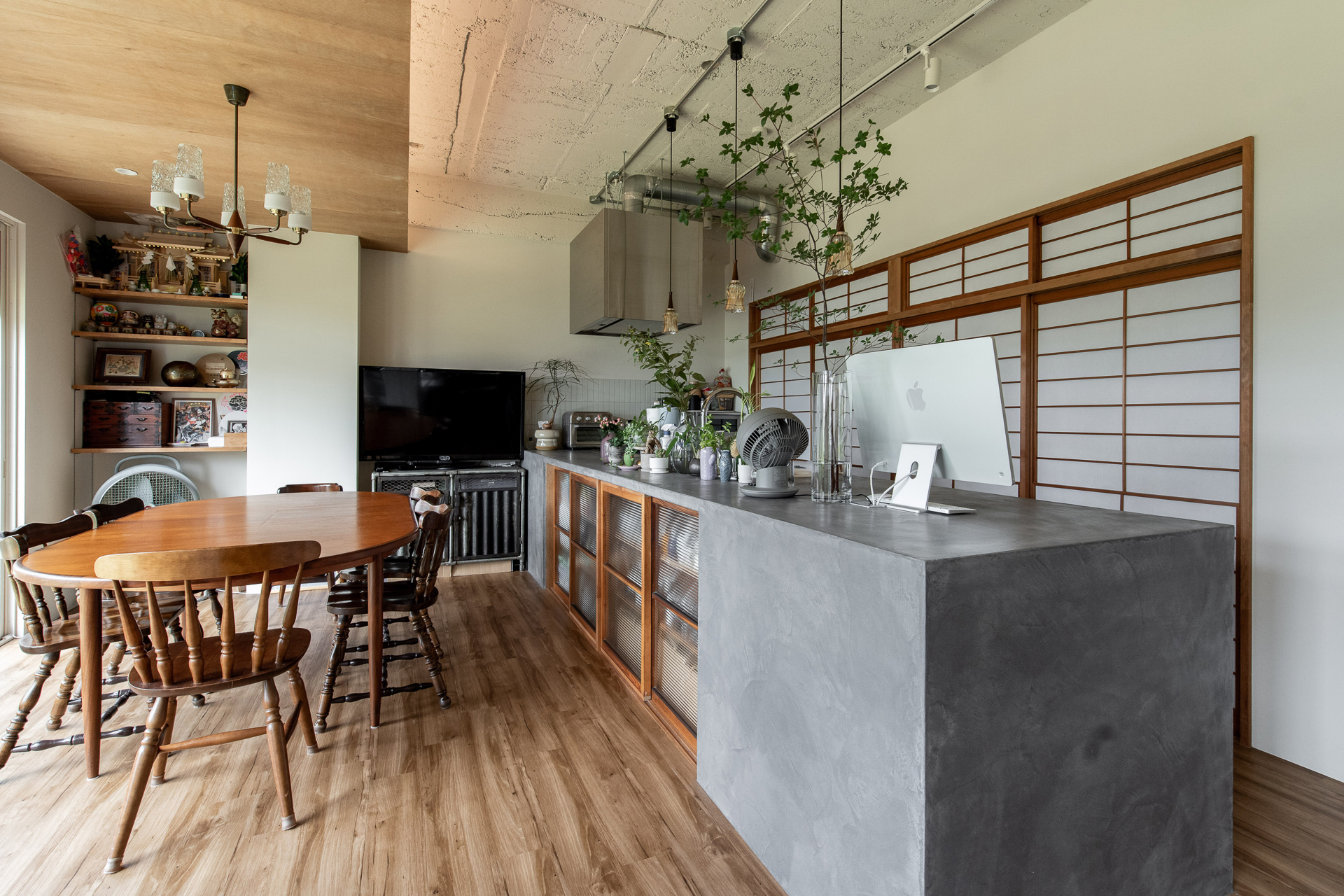 シルバー・グレーのインダストリアルな雰囲気と、木材・和の建具が調和したLDK。