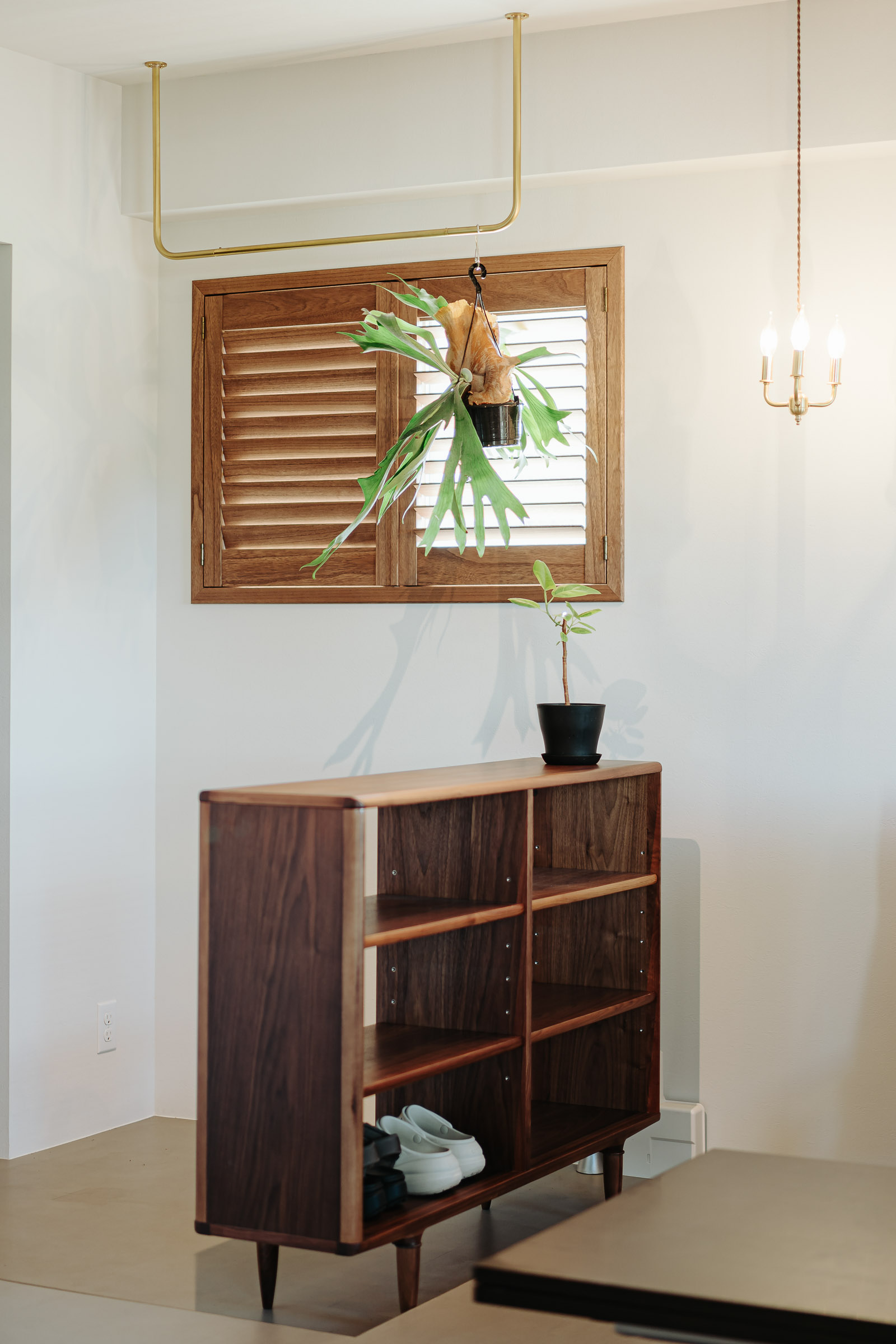 明るい窓辺に、観葉植物用の天吊り真鍮パイプを設置。