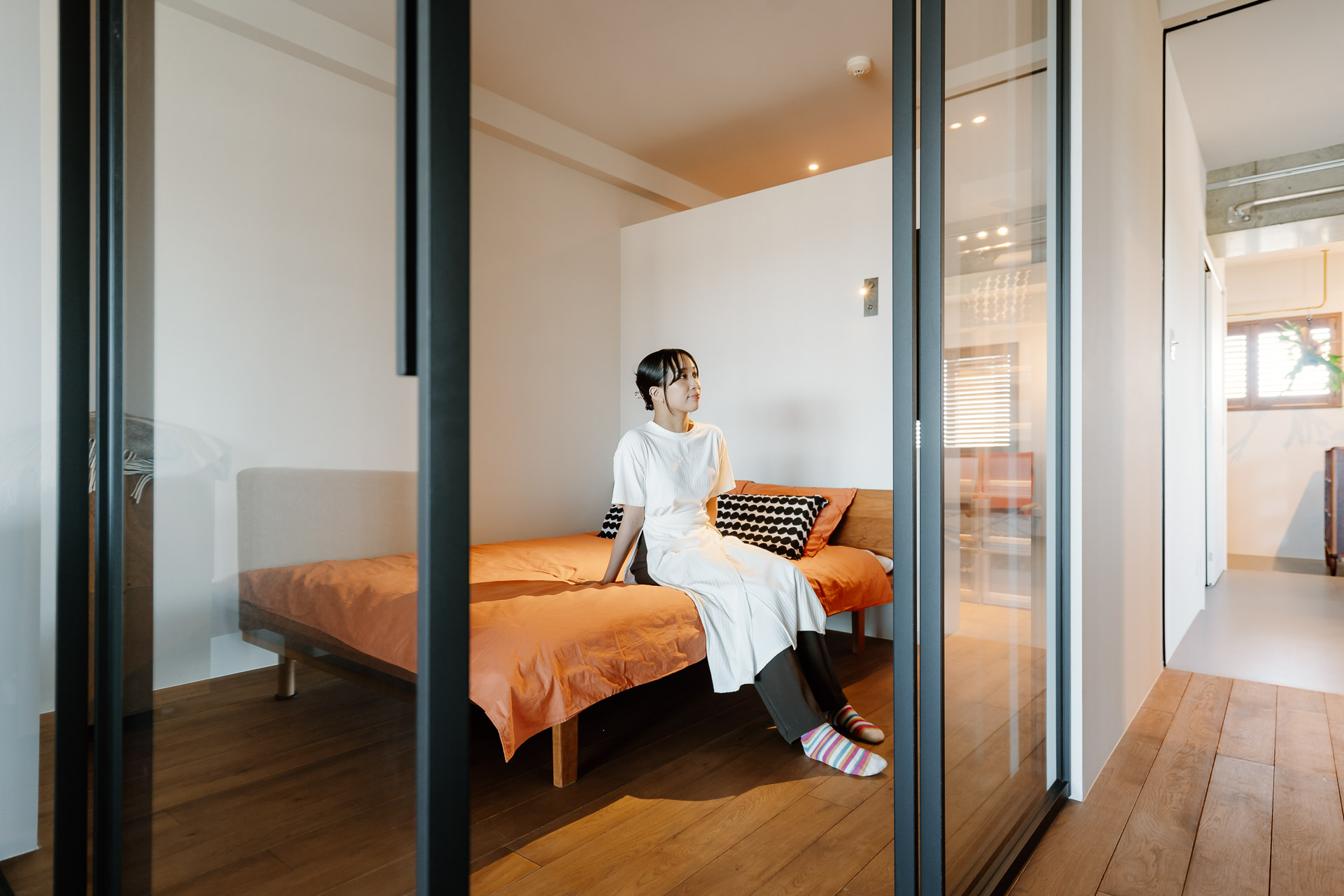 LDKと繋がり、ガラス戸で仕切ることもできるオープンな寝室。