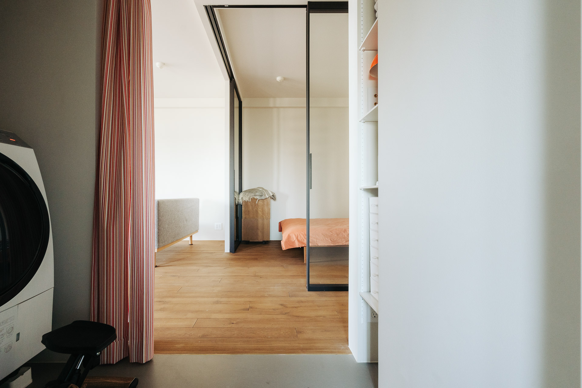インテリアはアクセントカラーを合わせて、オレンジストライプのカーテンで仕切る洗濯・脱衣スペース。