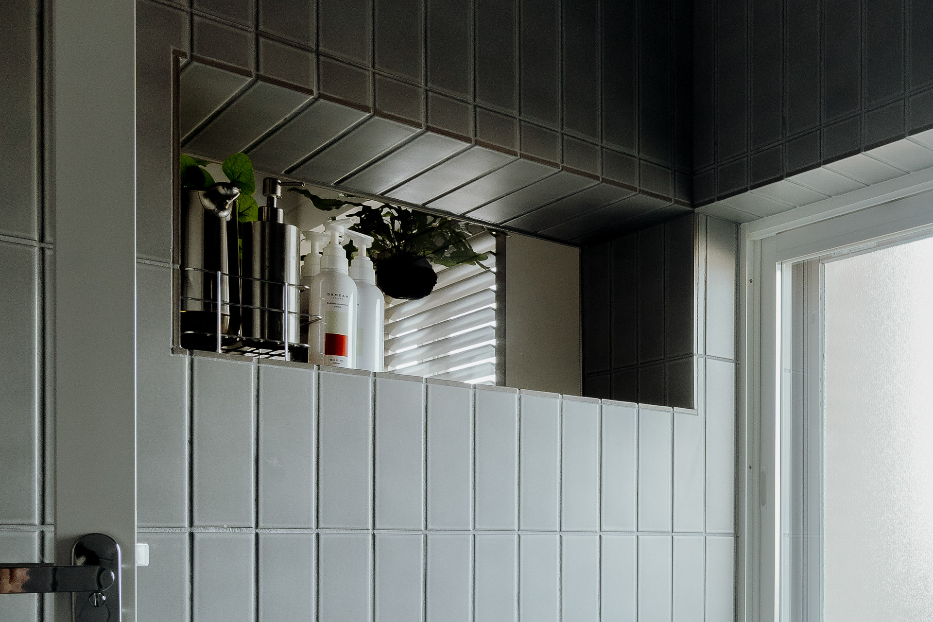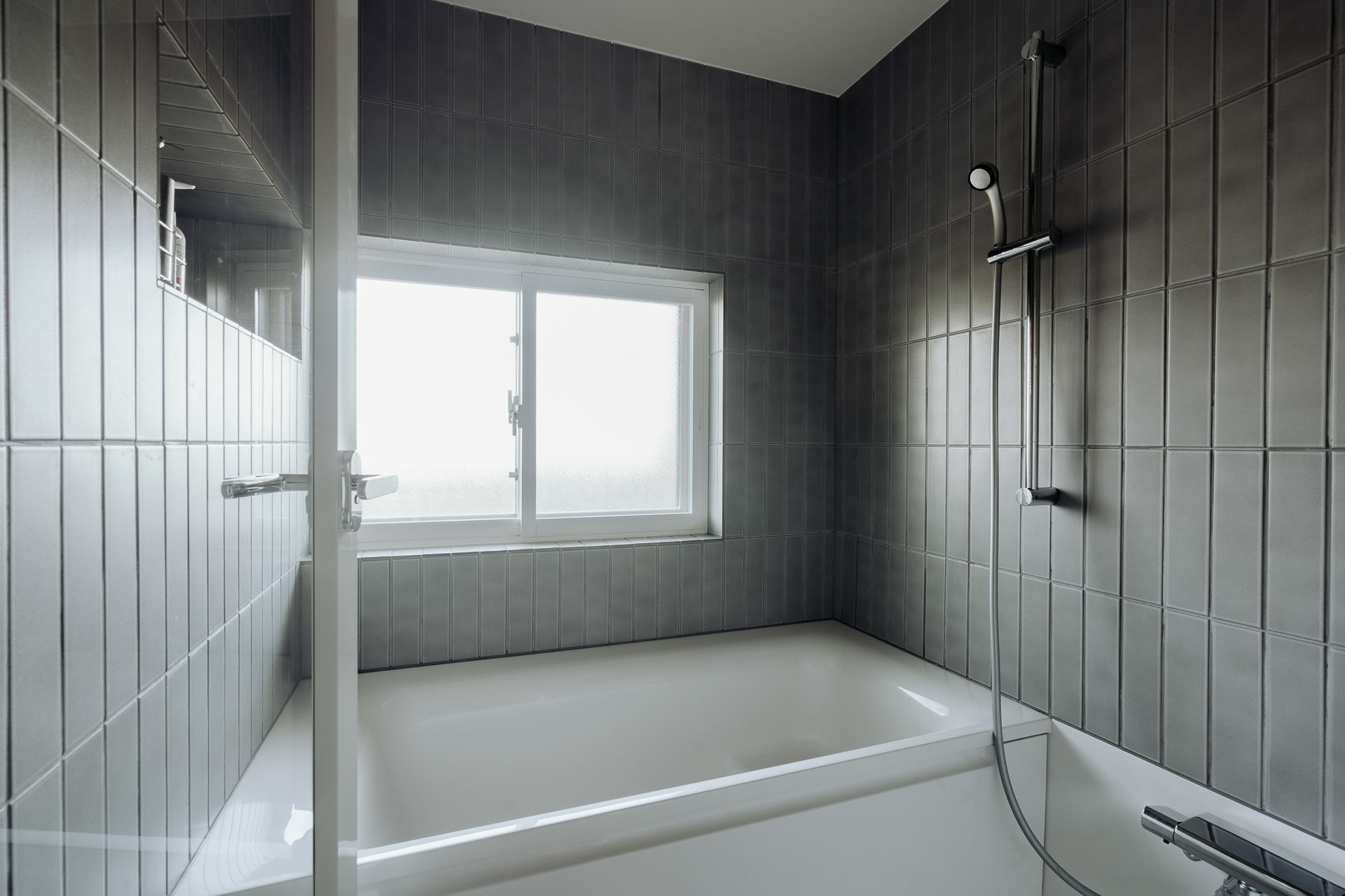 窓があって明るい浴室は、ハーフユニットバスにシックなグレーのタイルを合わせて造作しました。