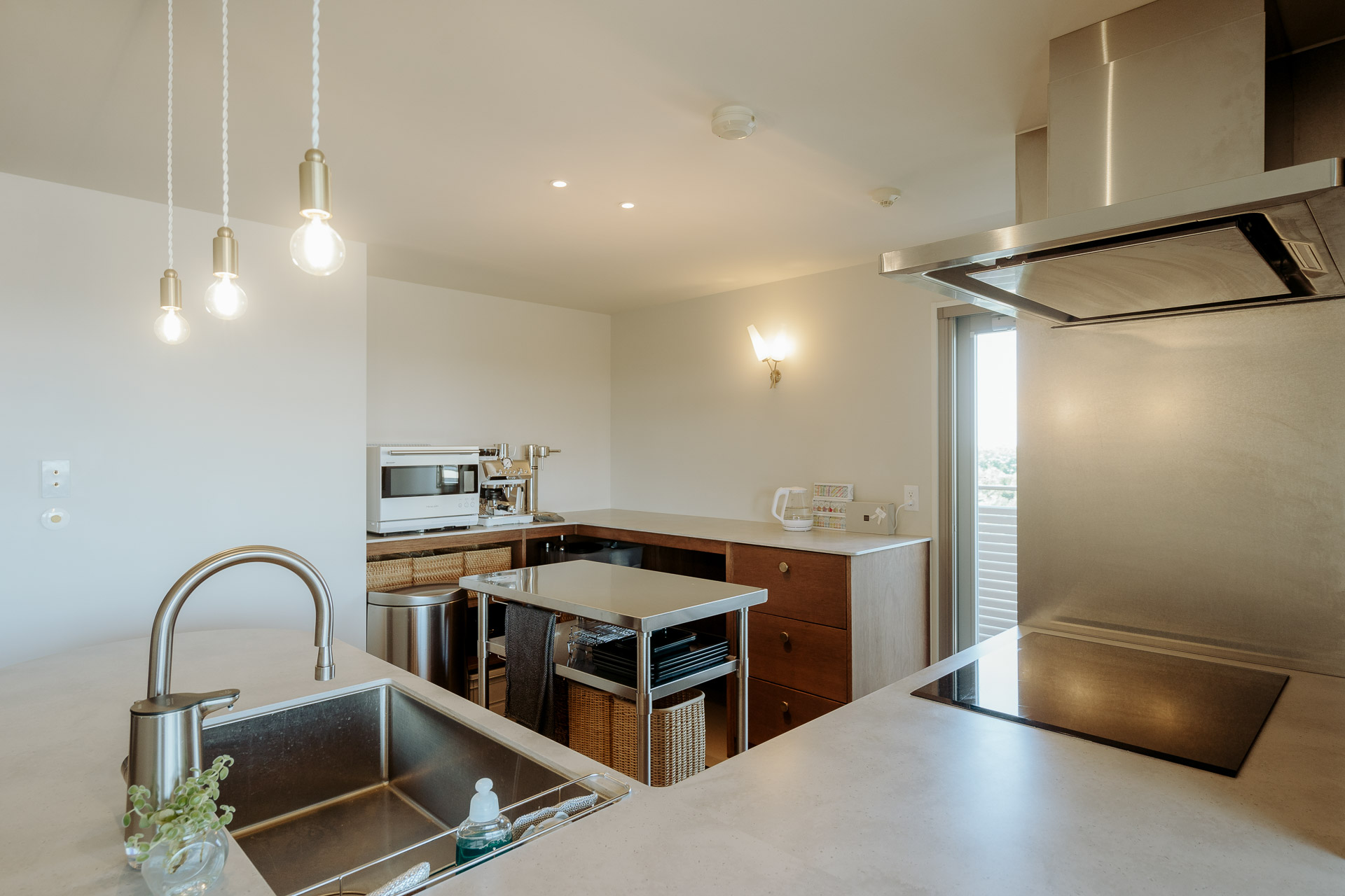ステンレスの可動式作業台は、壁面のカウンターにすっぽり収まるように設計しました。
