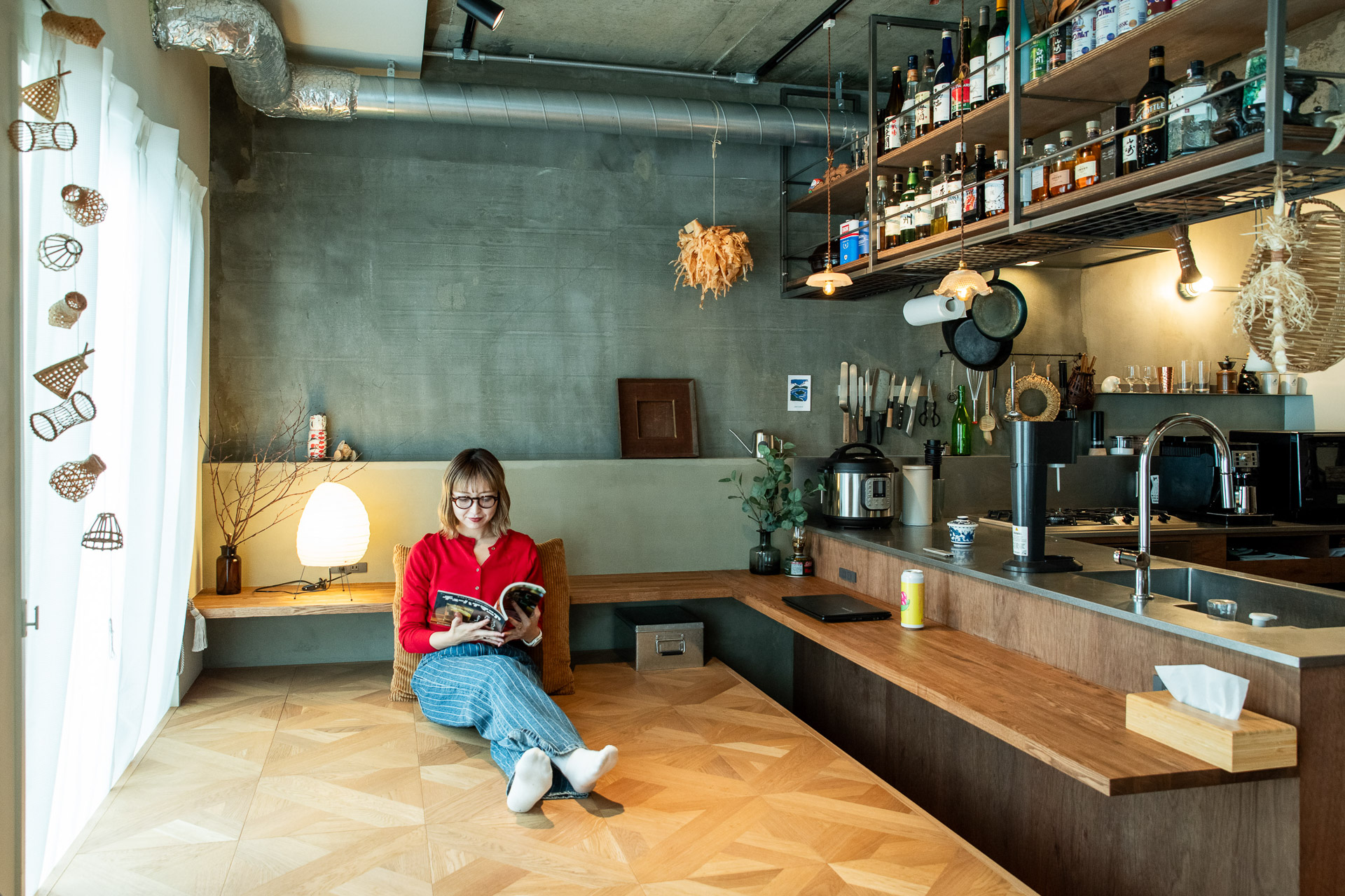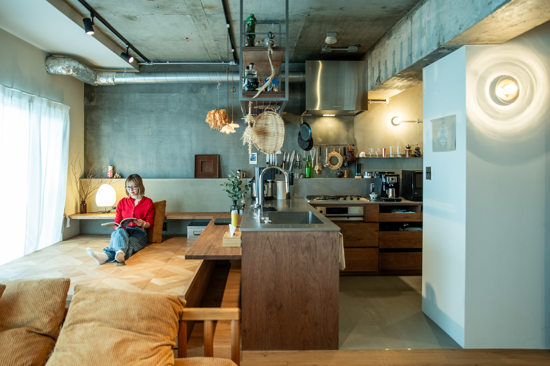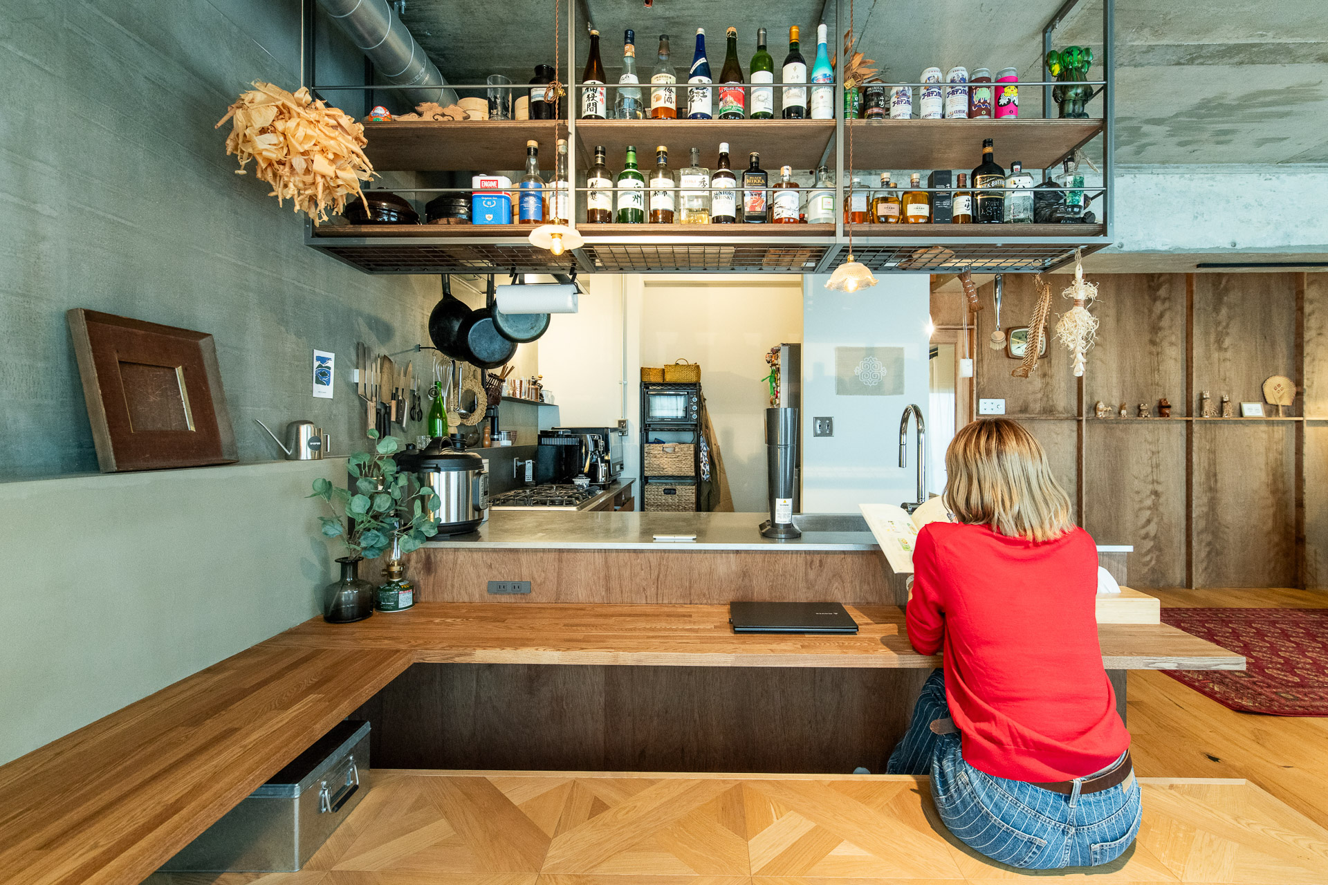 ステンレス天板で厨房のように造作したL字キッチンと、パーケットフローリングを貼った小上がり。