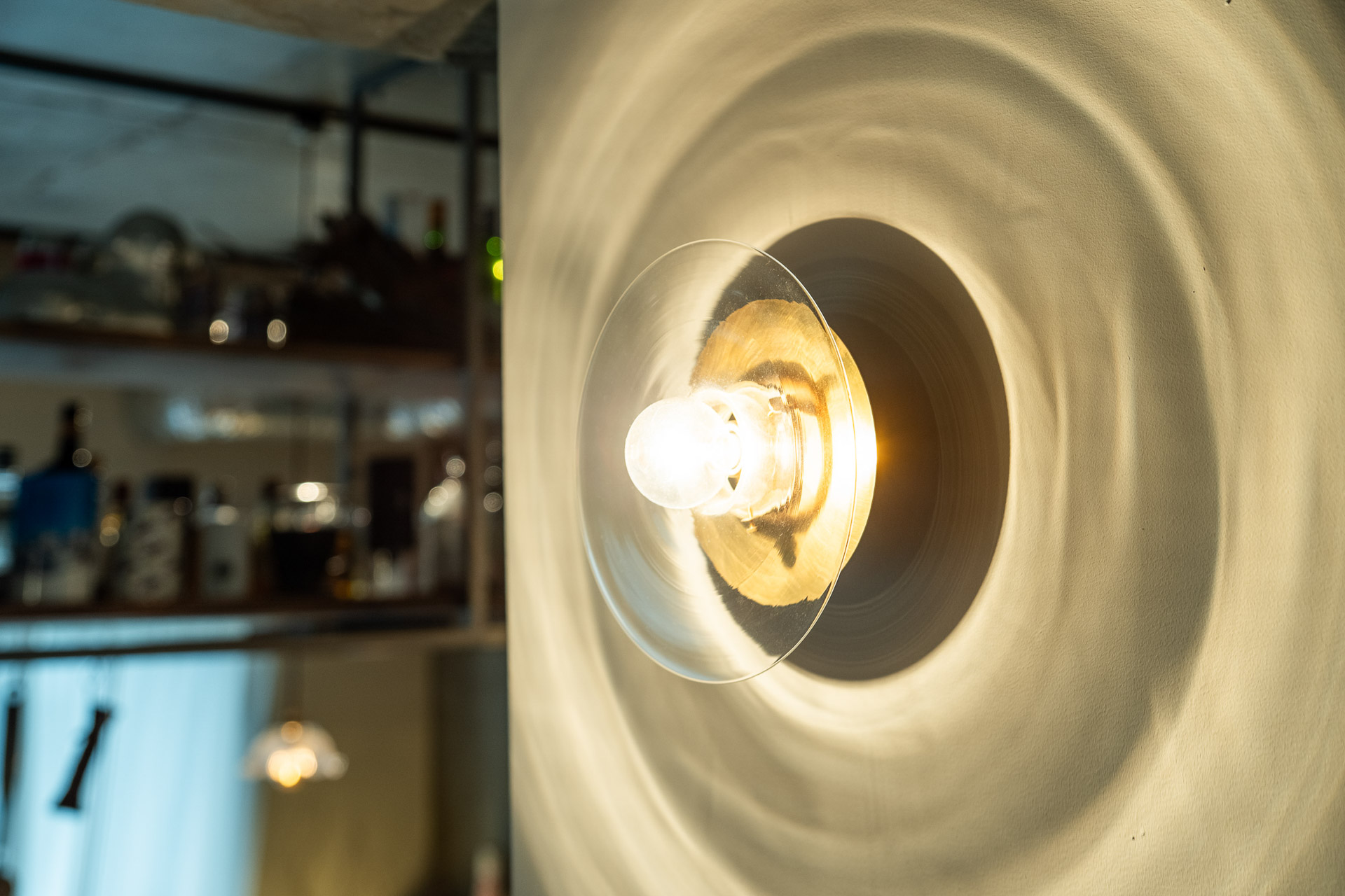 陰影が美しい〈+C〉のブラケットライト。ガラスは、ガラス作家の手による一点ものです。