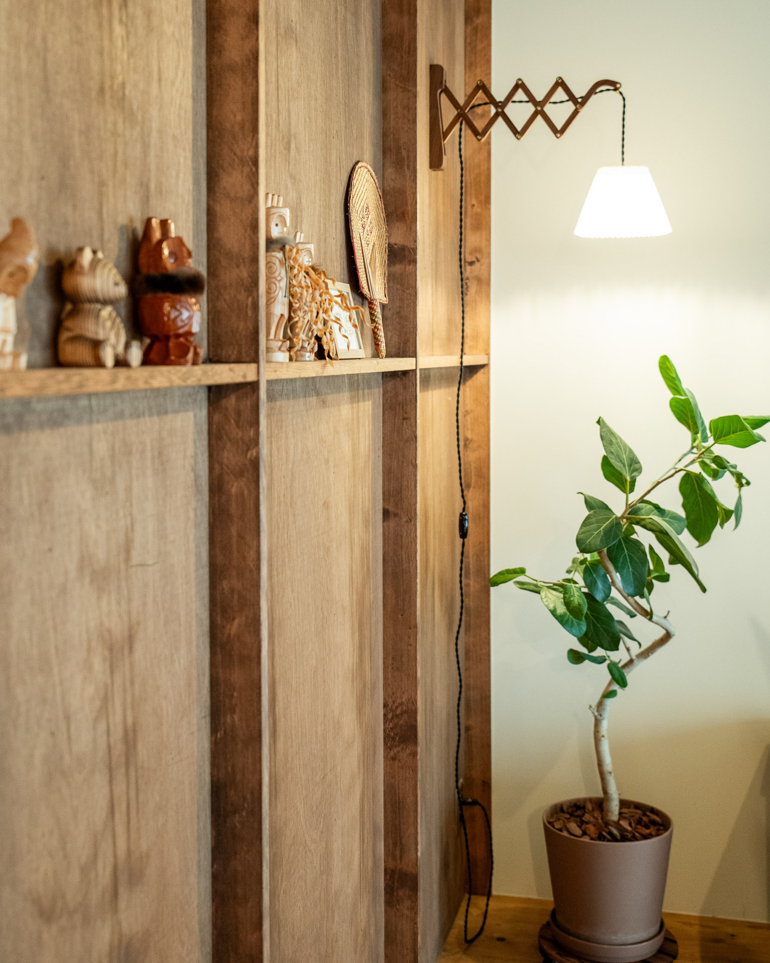 色合いを合わせて、木彫りのコレクションなどを並べています。