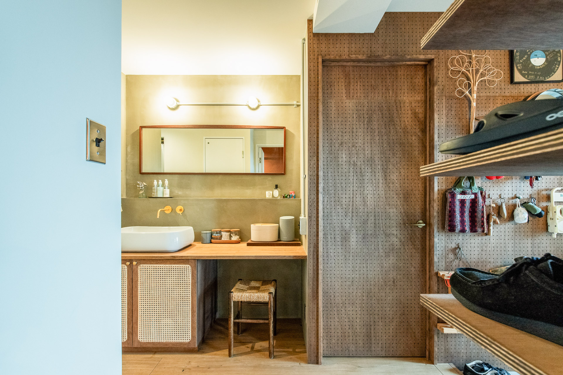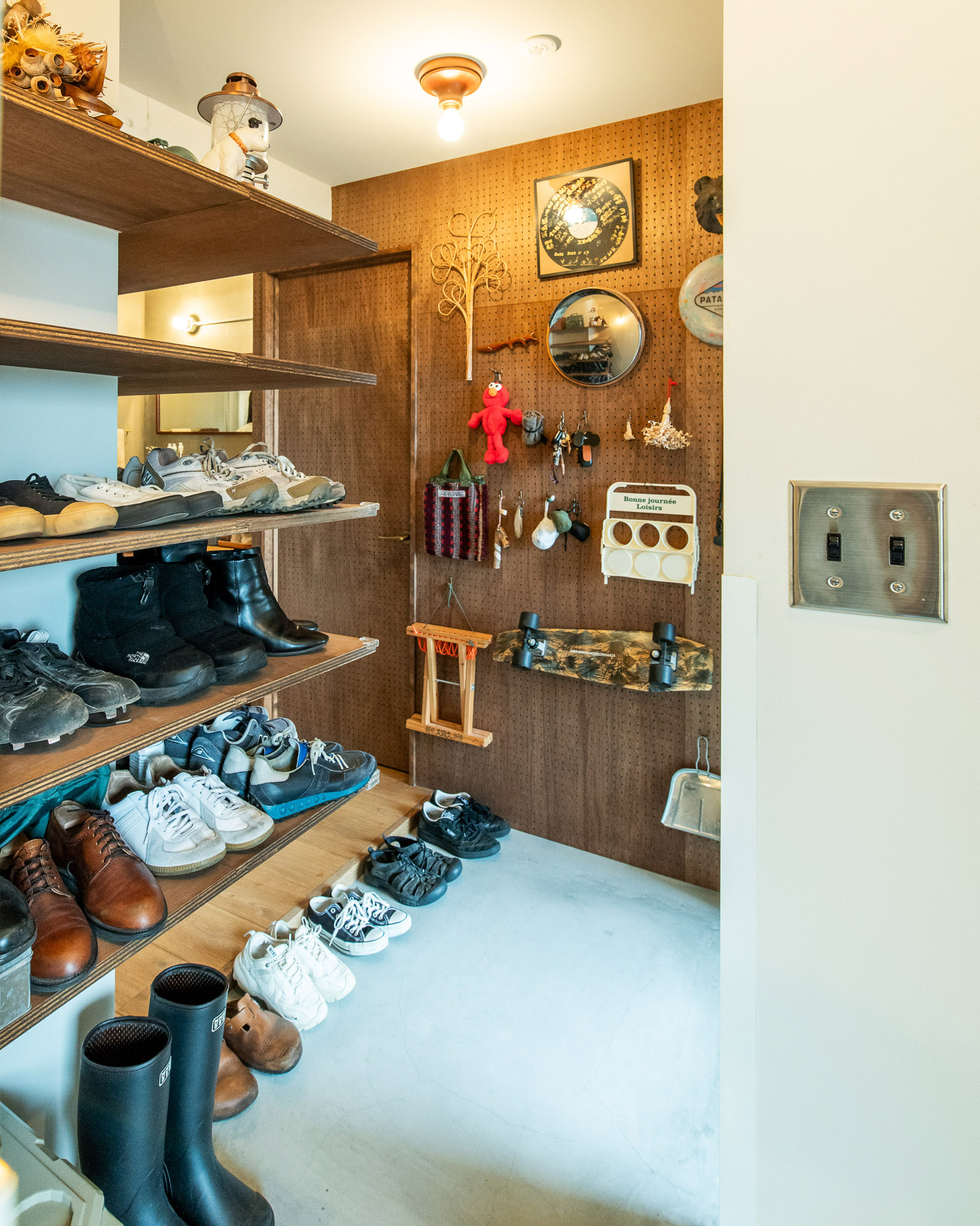 玄関ホールの壁面は有孔ボードで、賑やかな収納兼飾り棚に。