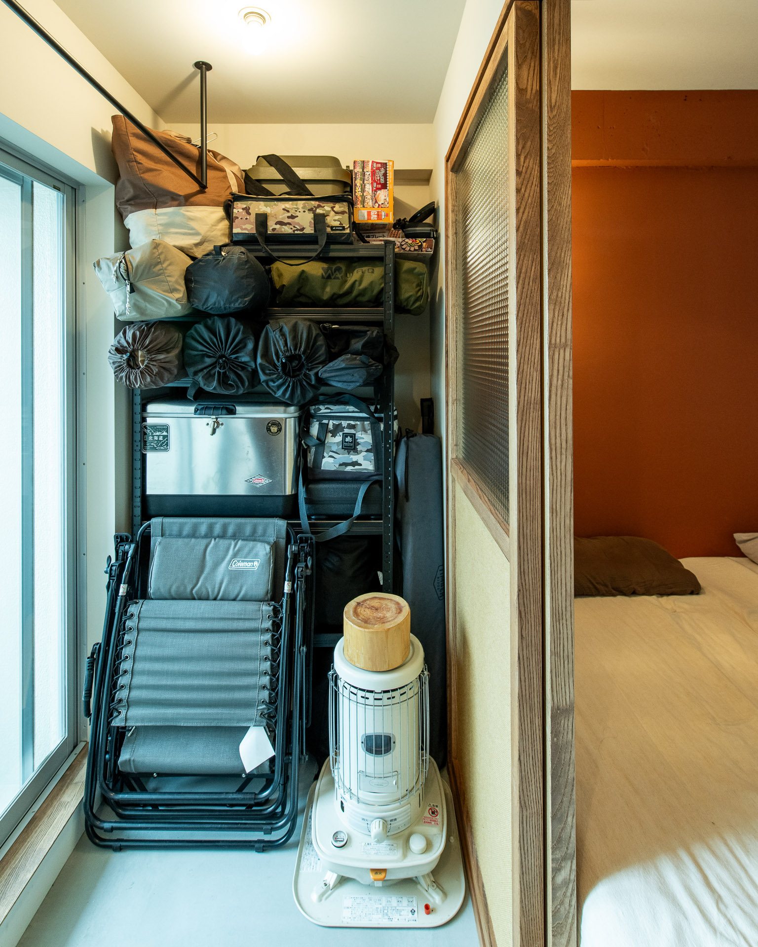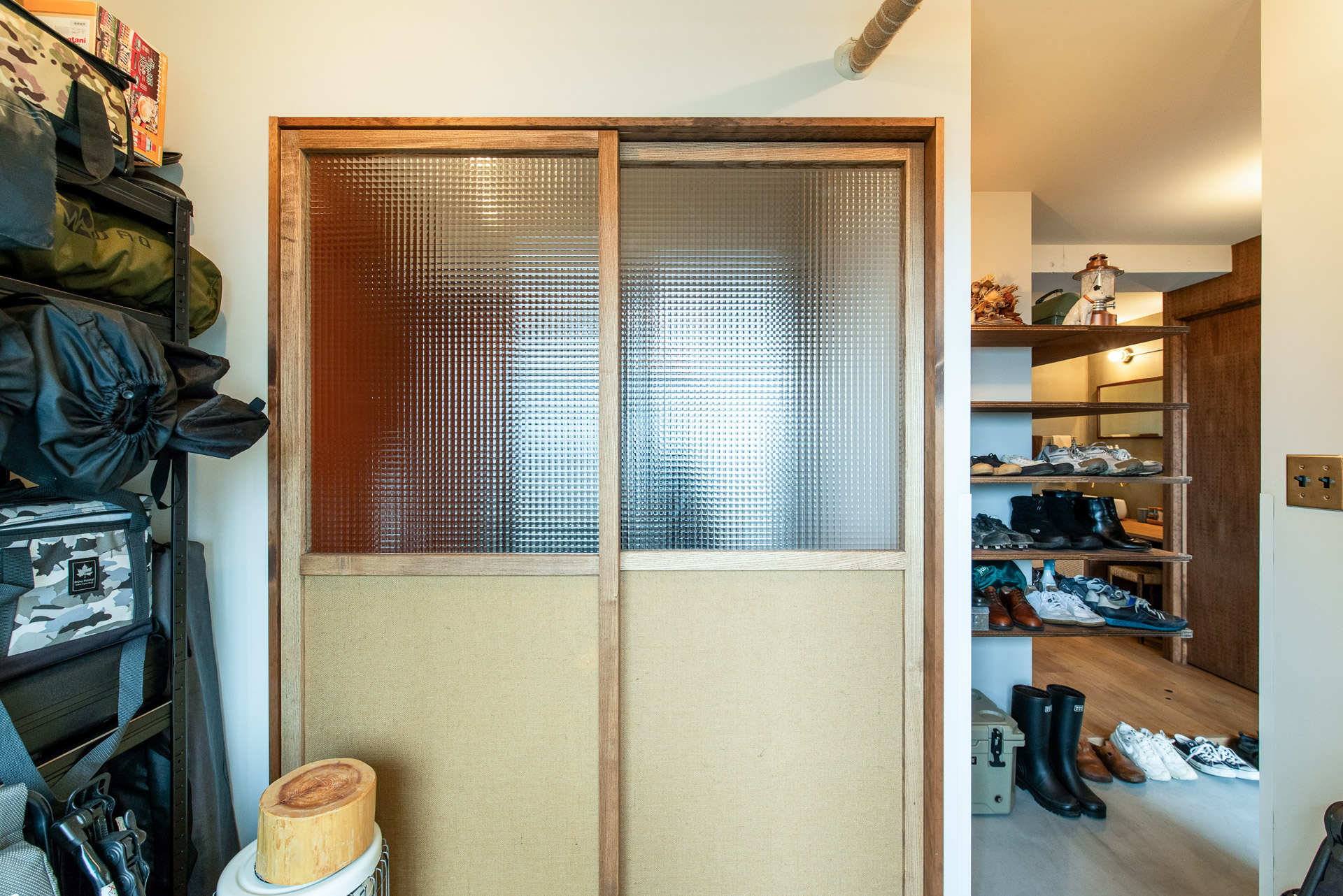 キャンプ道具は玄関から出し入れしやすいよう、土間スペースに棚を作りました。