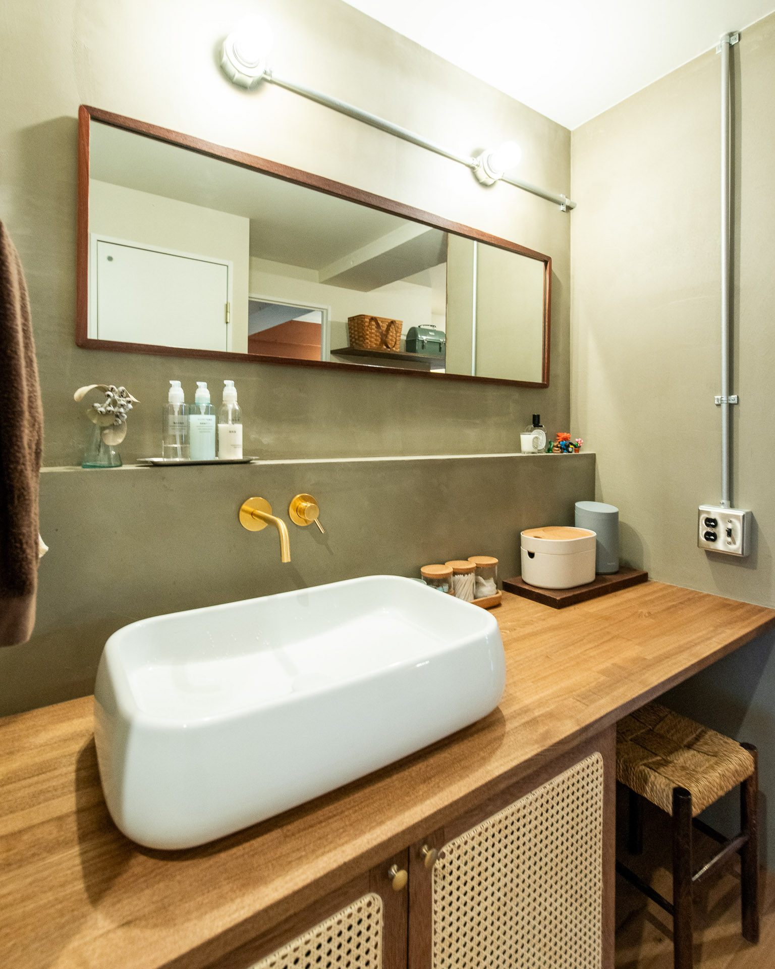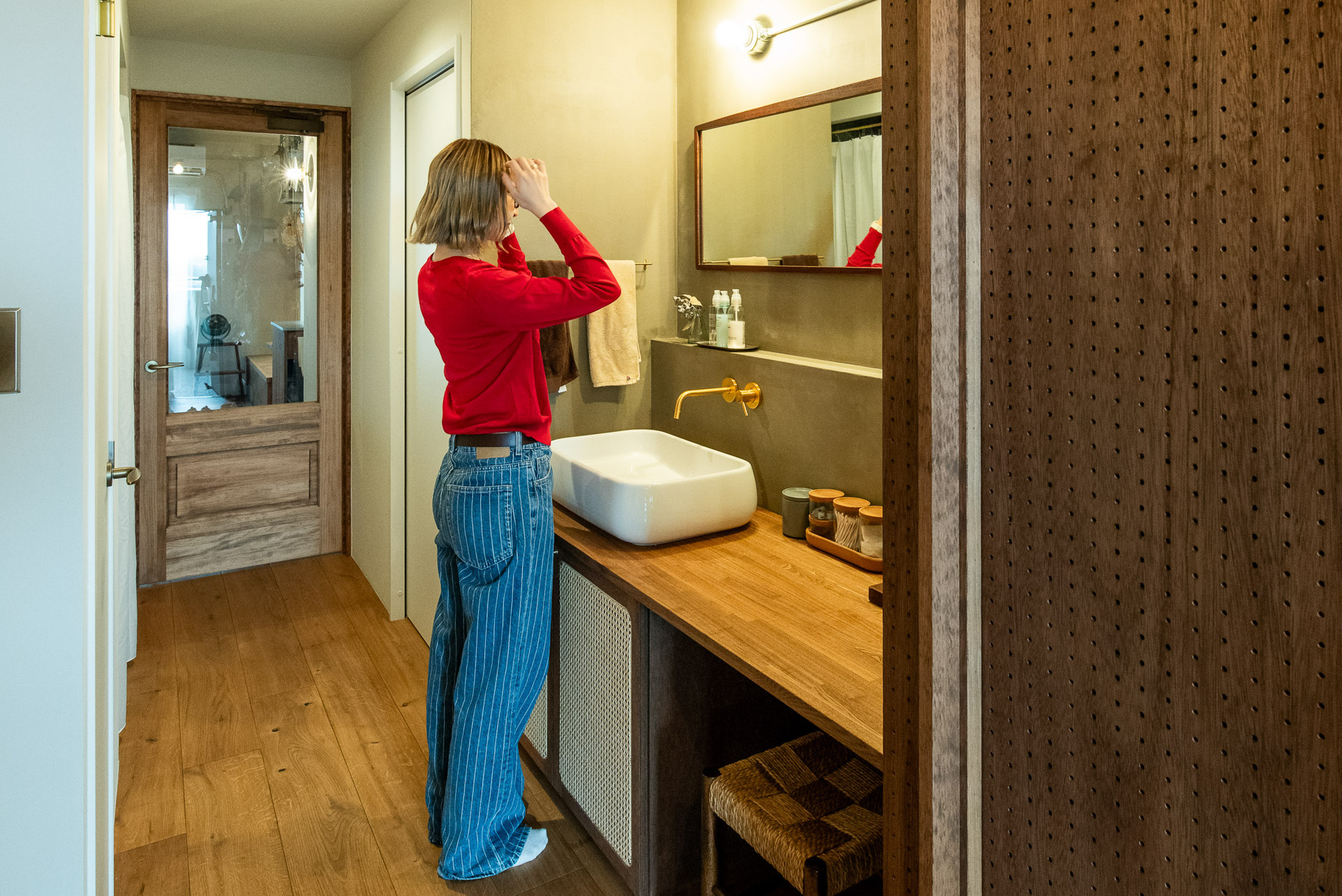 朝起きて寝室から出ると、洗面スペースが目の前にあります。右側のドアからは洋室へ。