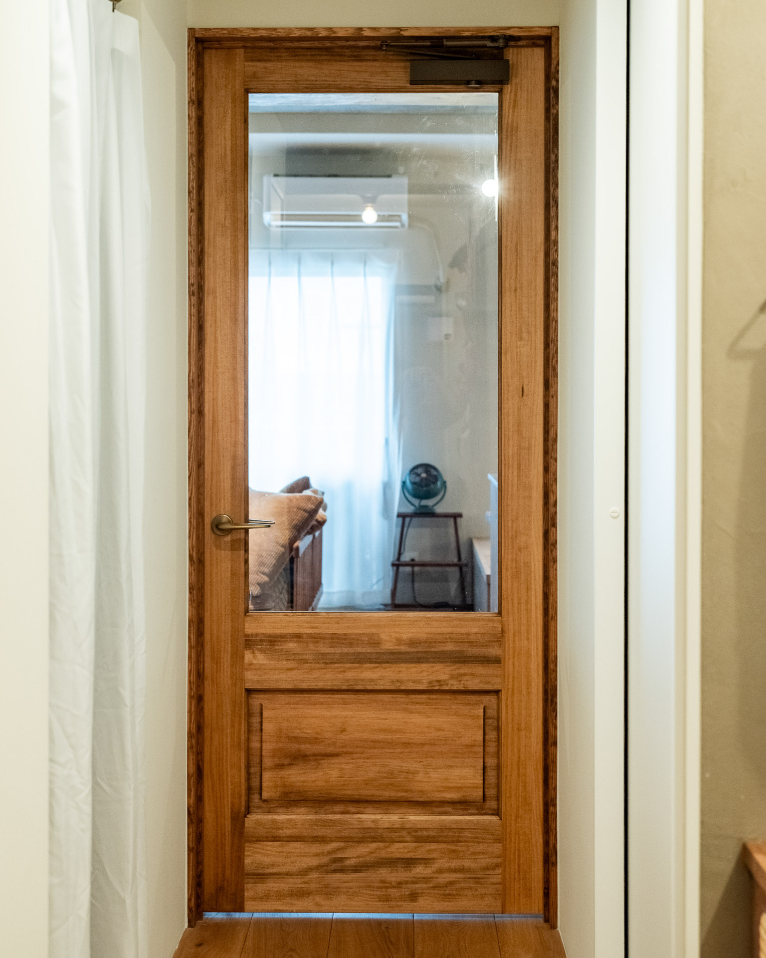 チェッカーガラスをはめ込んだ引き戸の向こうは、夫婦の寝室。