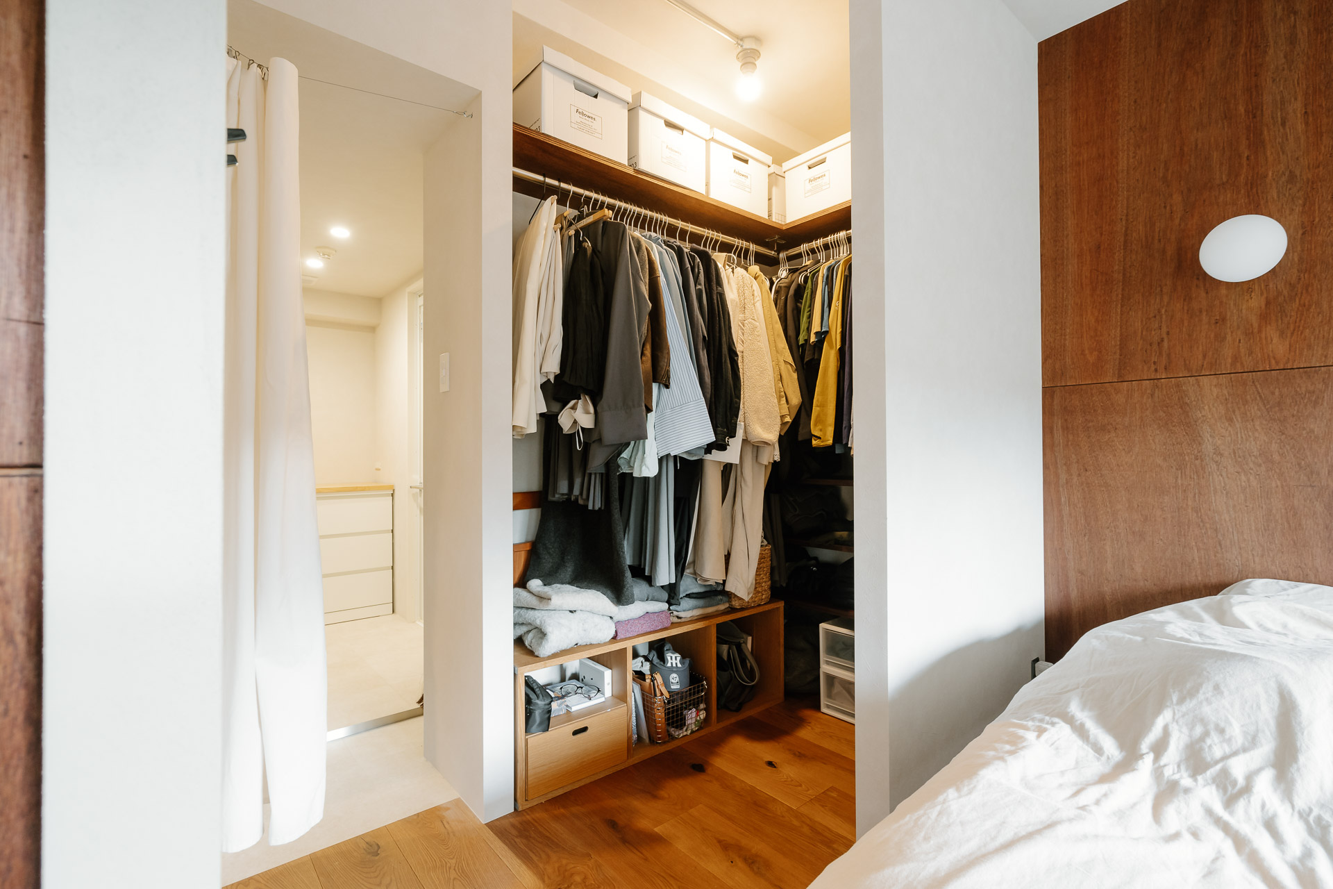 寝室の横にクローゼット、その先に洗濯・脱衣スペースと浴室があります。