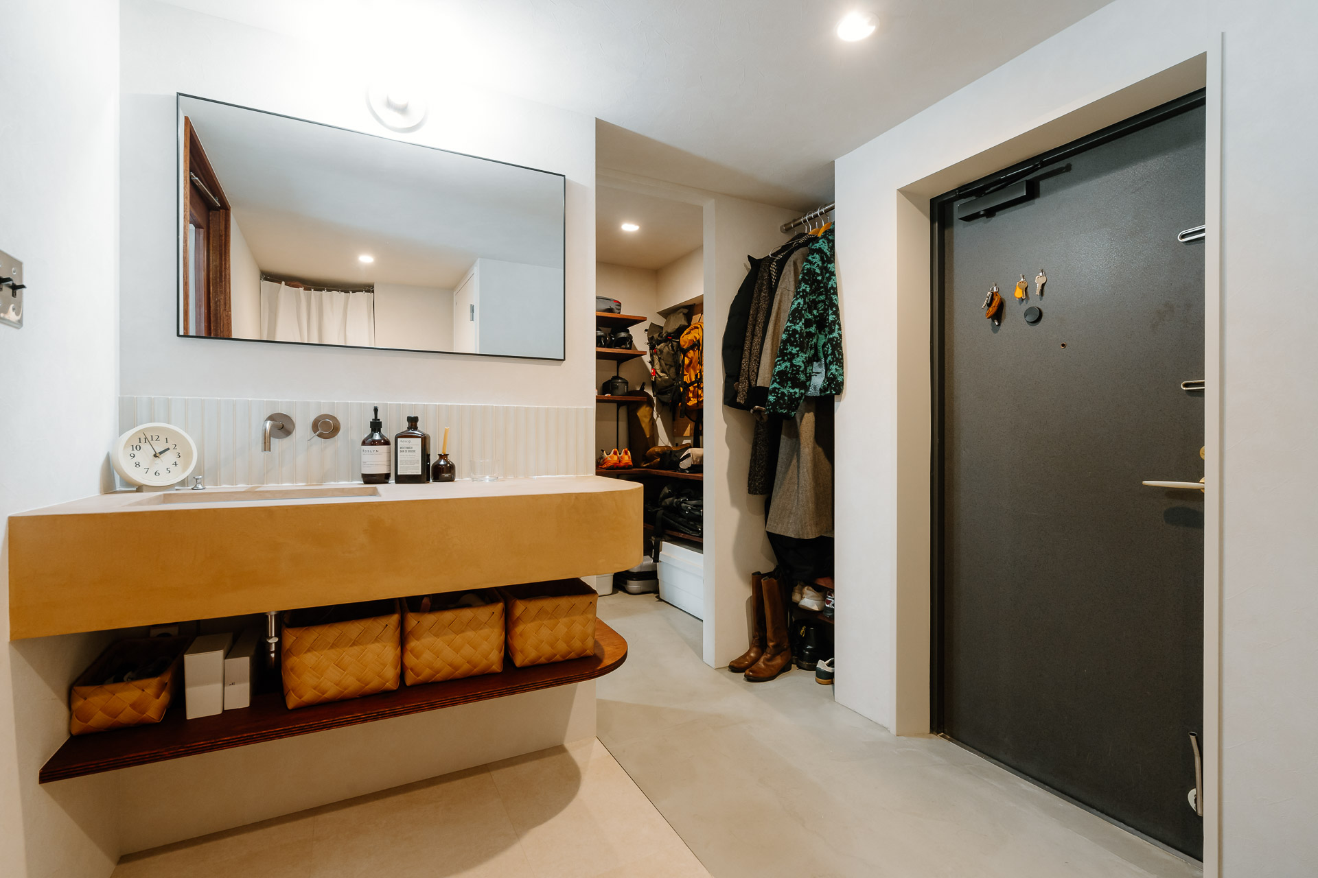 スノーボード用品やアウトドアグッズを収納できるよう、広い土間収納を作った玄関。