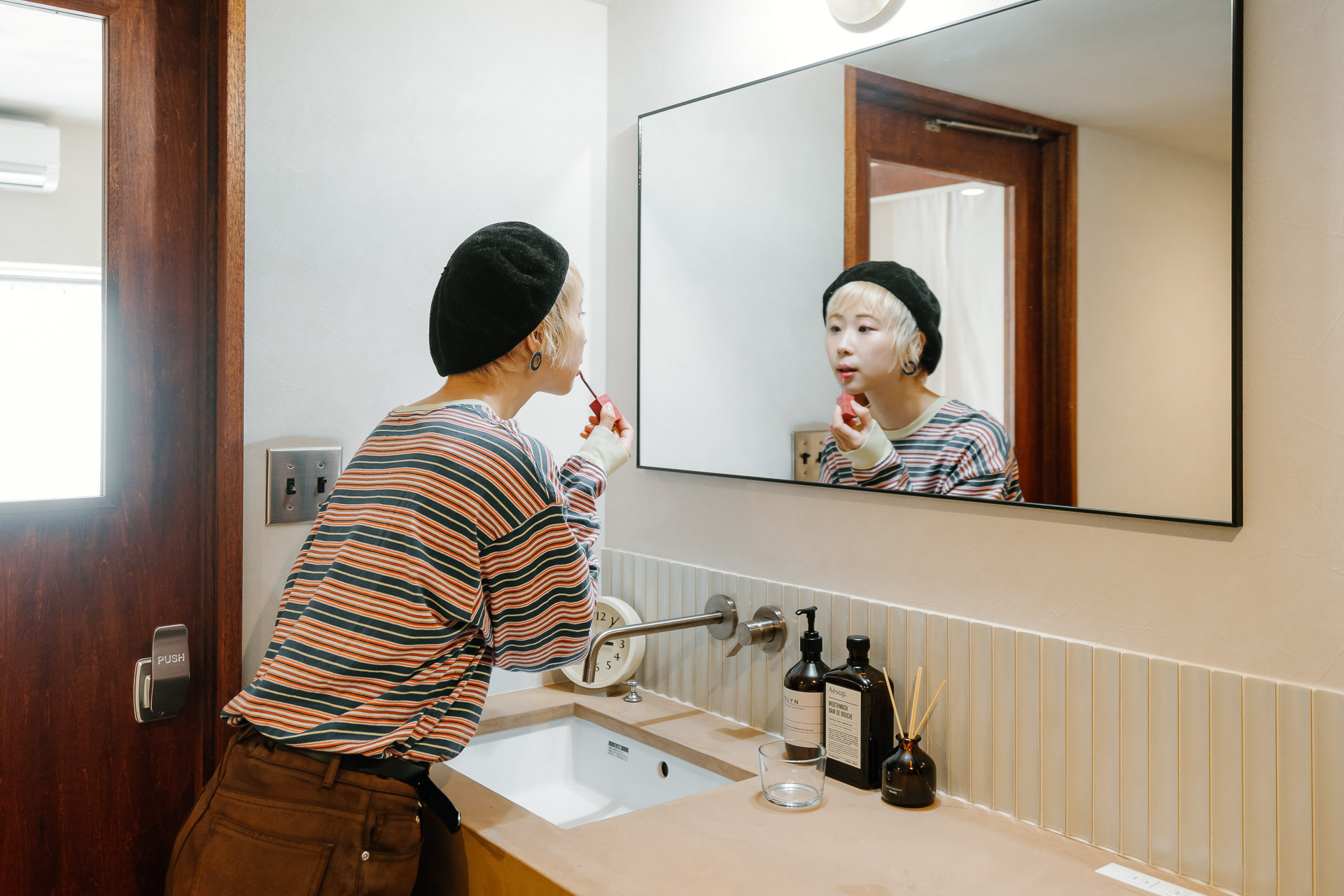 大きな鏡で、2人並んでも身支度しやすい造作洗面はモールテックスで仕上げました。
