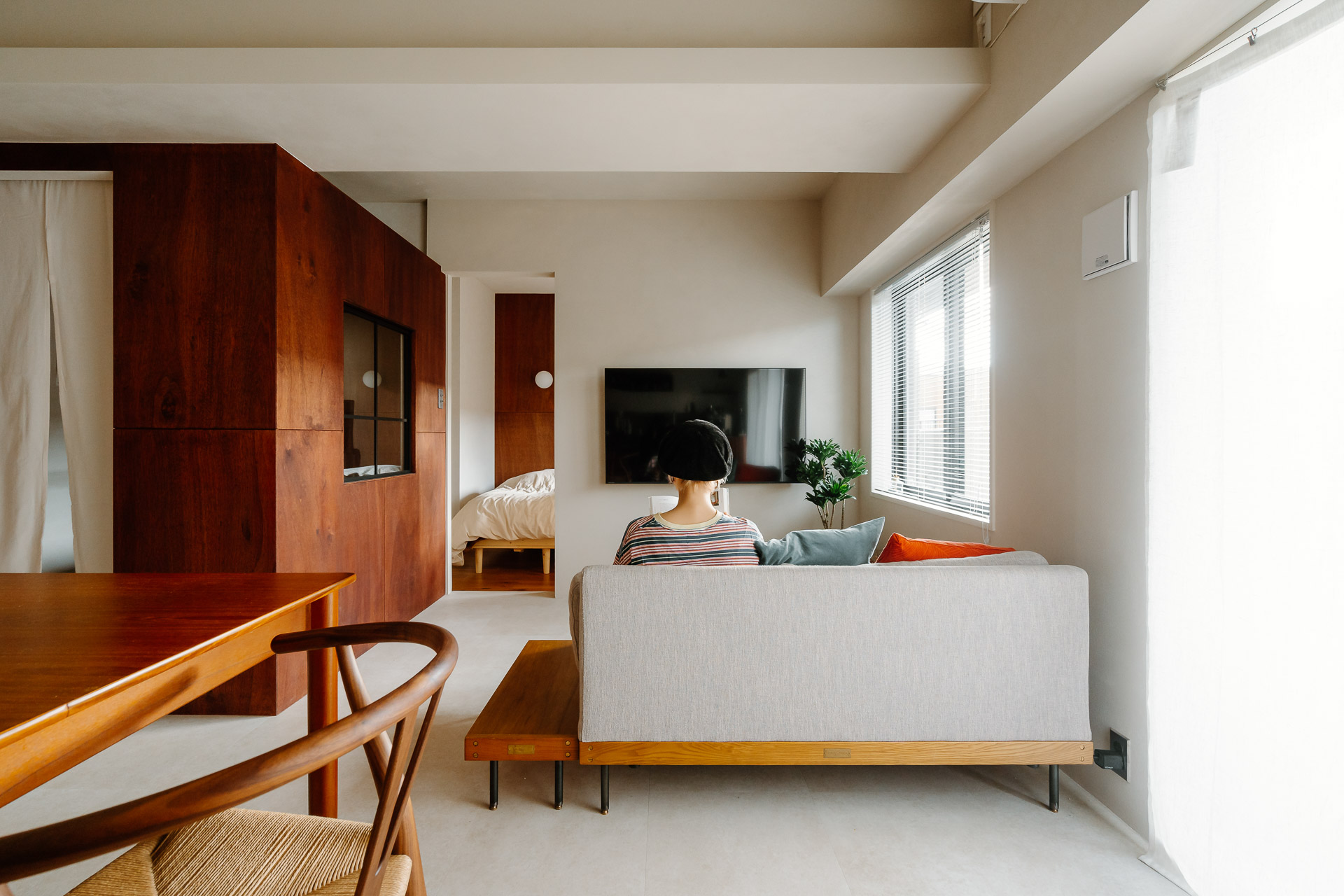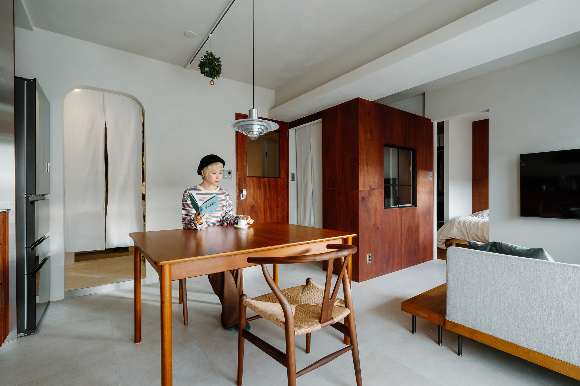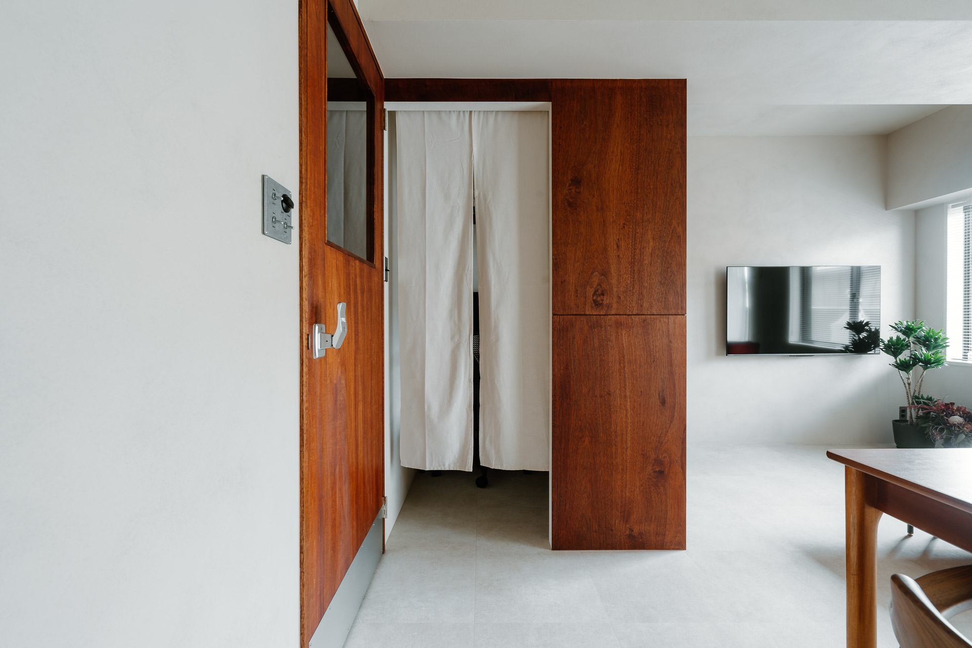 寝室へと繋がるテレビ横の扉も合わせてペイントしてあり、閉めるとすっきり見えます。