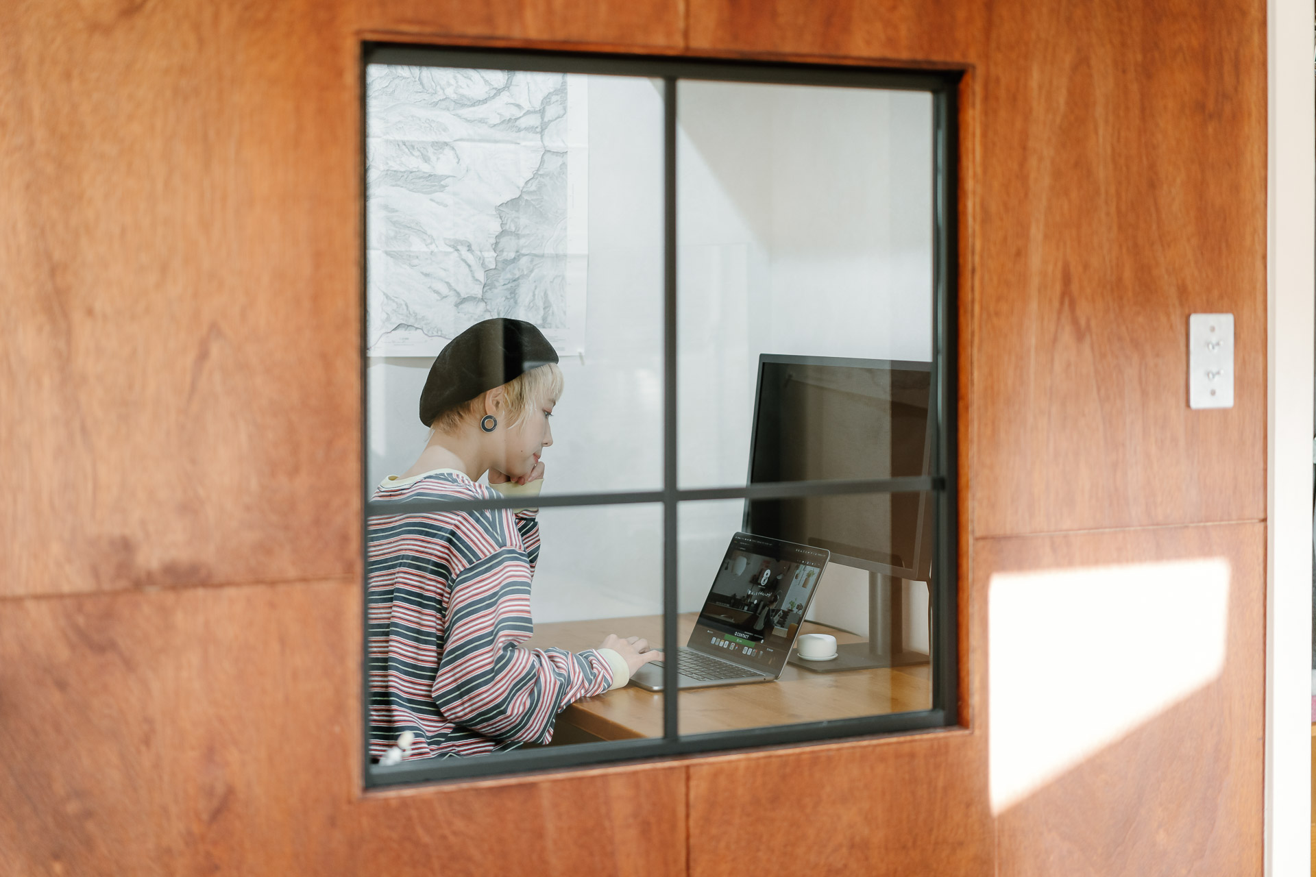 アプリを作ったり、趣味の時間も過ごすワークスペース。集中するとのめり込みがちなご主人のために、窓からリビングが見えるようにデザイン。