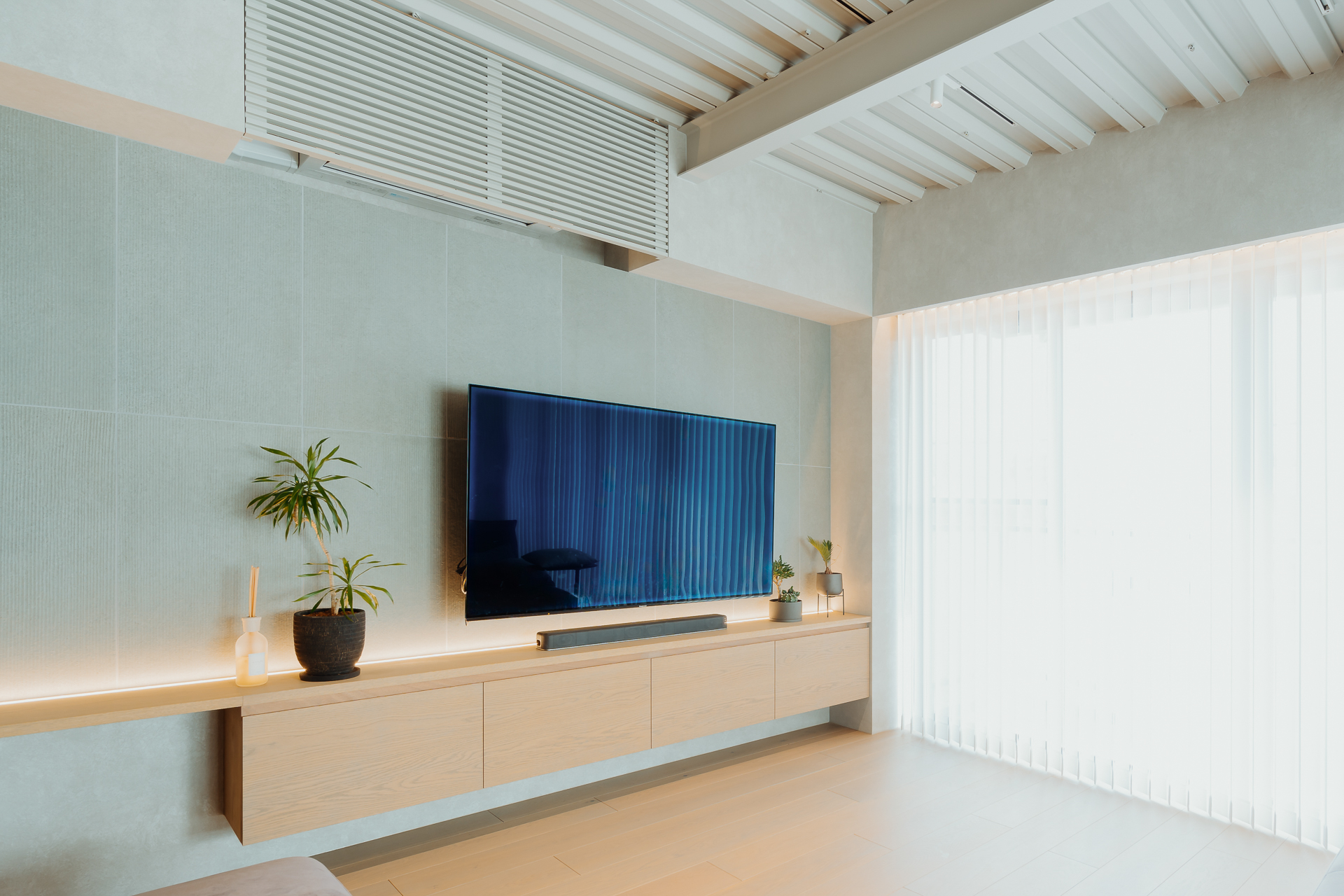 ひとつづきで造作したTVボードには、間接照明を取り付けました。