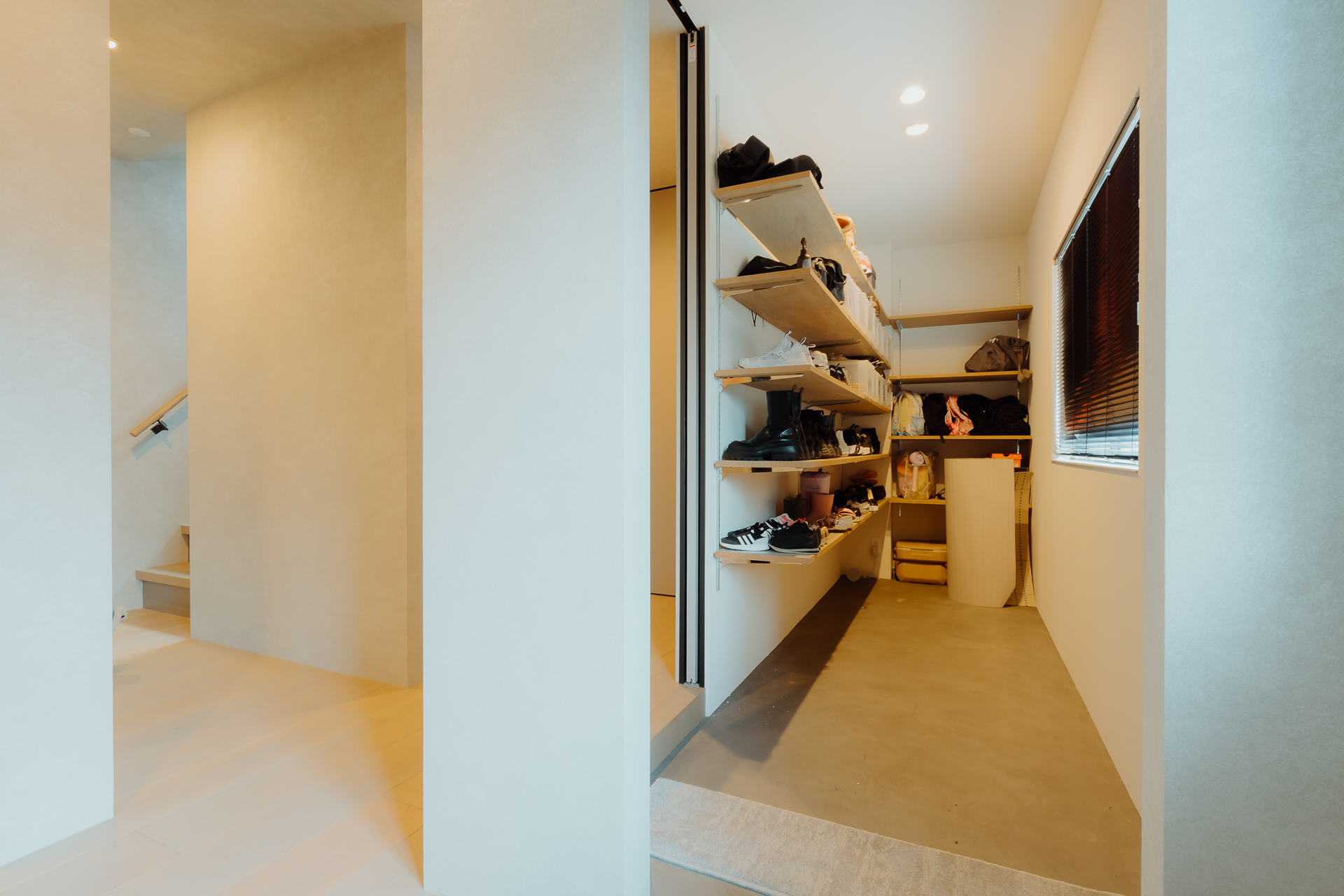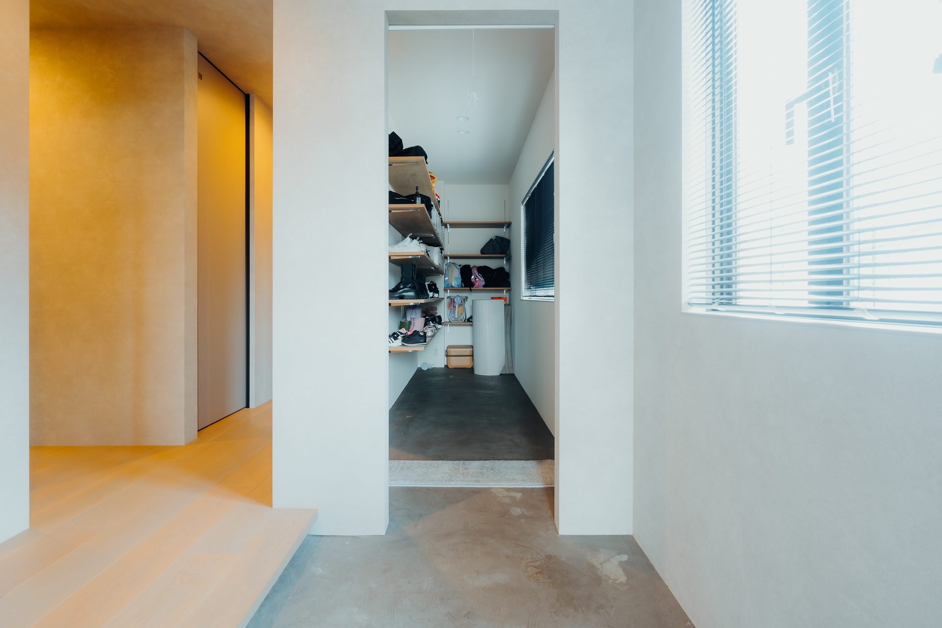 たたきはモールテックス仕上げ。ロールスクリーンで仕切った先は、可動棚を設けた土間収納です。