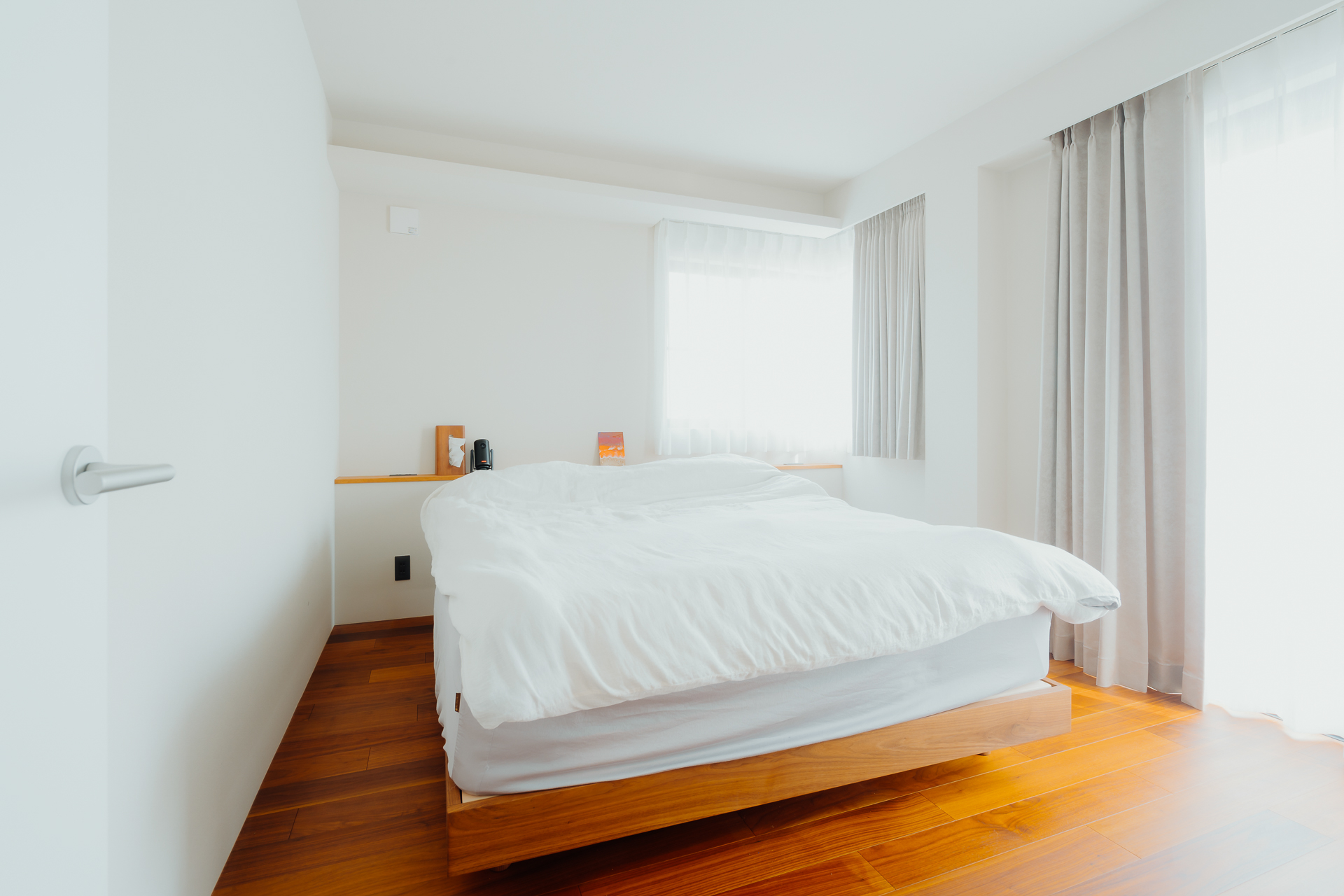 部屋の雰囲気に馴染むよう、エアコンはルーバーで目隠し。