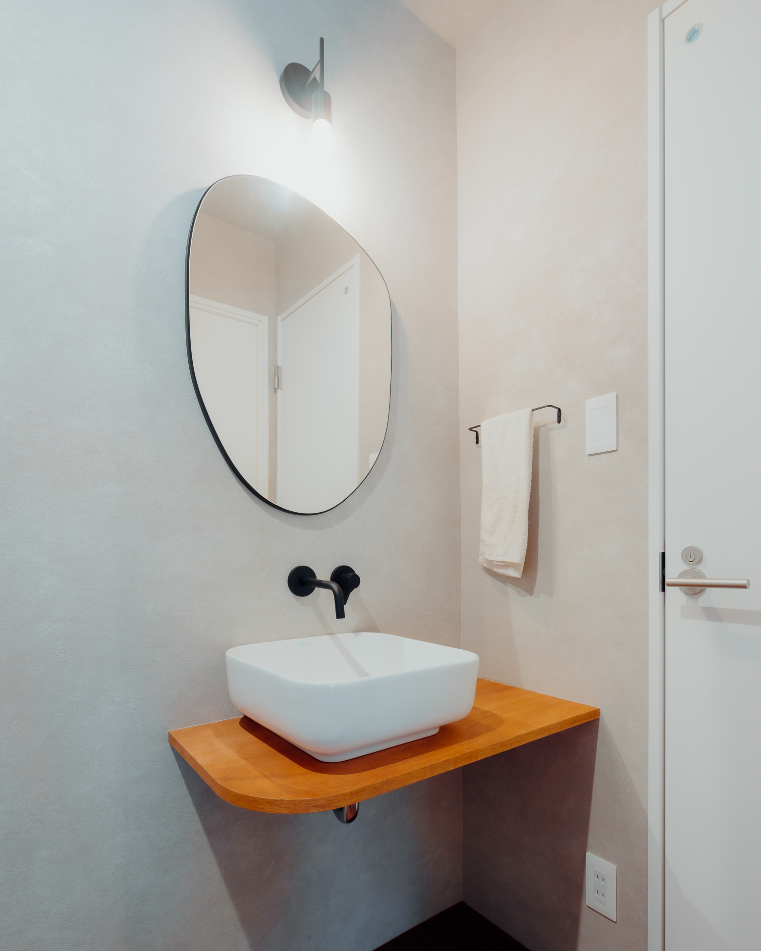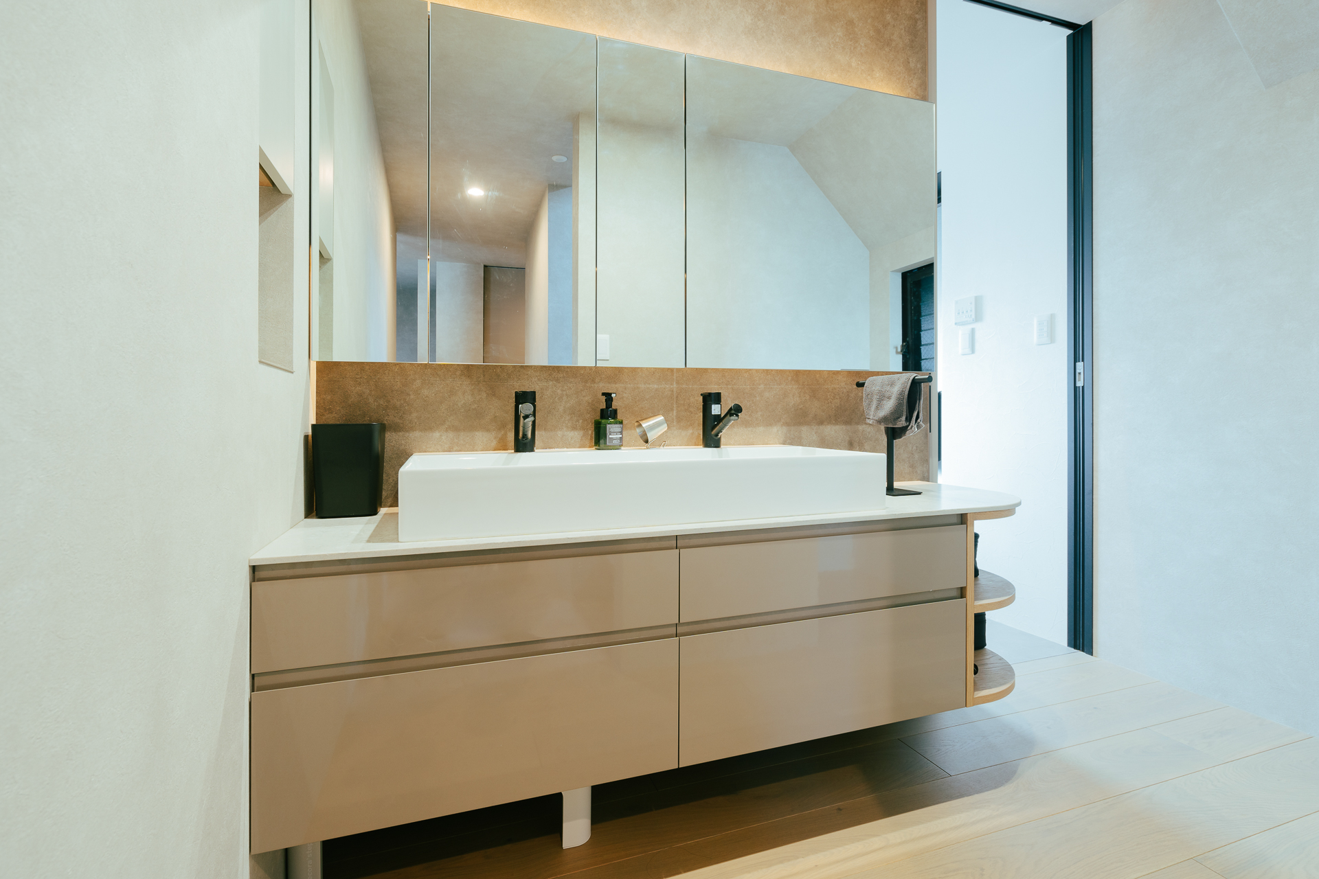 洗面スペースには、大きな鏡と2水栓付きの洗面ボウルを設置。
