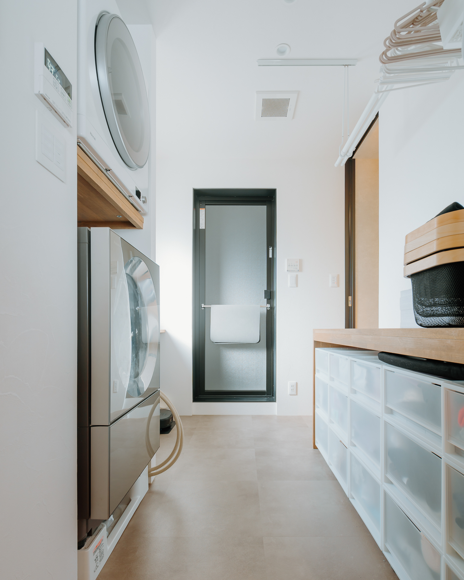 まだ小さなお子様を見守りながら、効率よく家事ができるように、水回りをまとめて動線を計画。
