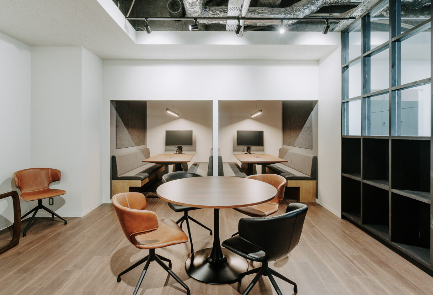 エイトデザイン:希望を反映させて、オフィスを仕事に集中する執務室とラウンジに分けることにしました。ラウンジは、休憩だけではなく打ち合わせ場所としても使用できるように、いろいろな仕組みを設けてあります。モニター付きの半個室の席は、休憩時と打ち合わせ時で照明の色を変えることができますし、雰囲気に馴染んだ吸音パネルを貼っているので声の響きを心配する必要がありません。また、垂れ壁のところにはロールスクリーンが備え付けてあるので、必要な時は空間的にも仕切ることができます。過ごす場所が変わることで、意図せずともオンとオフの切り変えができるというのは、気分転換にもなりますね。