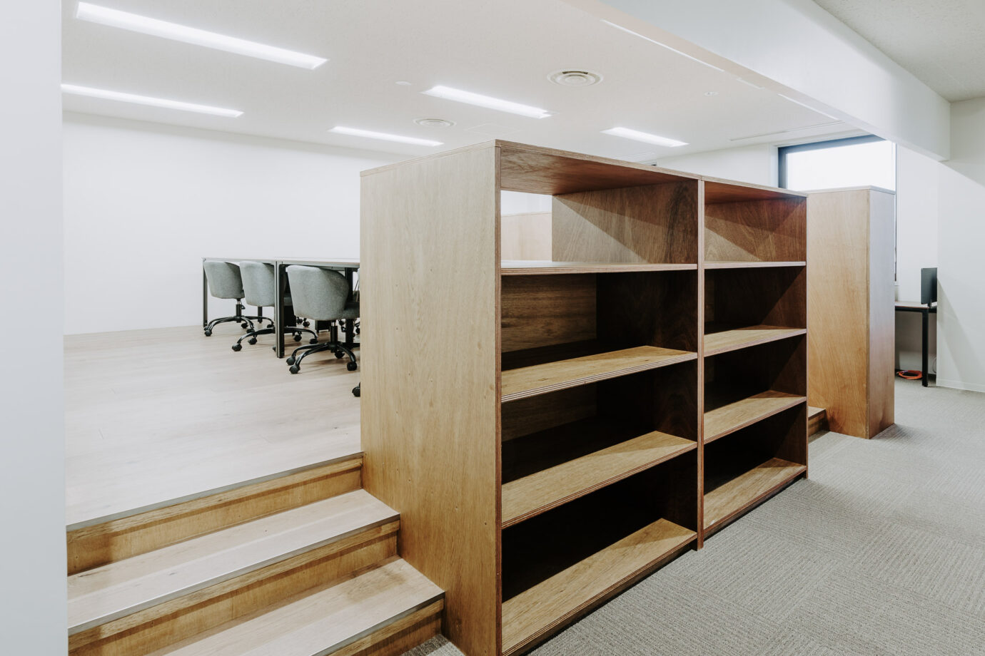 エイトデザイン:普段業務であまり関わりがない人同士でも、同じ会社で働いているという連帯感が生まれますね。執務室の中には、機器のキッティングなど、クライアント向けに多くのデバイスを並べて作業する為のラボのスペースを作りましたが、立ちながら作業されることもあるということで、ロッカーと棚の上部をカウンターとして使うこともできます。ここにも壁は作らず、収納棚で緩やかに空間を仕切っていて、階段を上がった場所にあるので視界に変化をつけているイメージでしょうか。この床の段差を利用して、奥行き180cmもある大容量の床下収納を設けてあります。