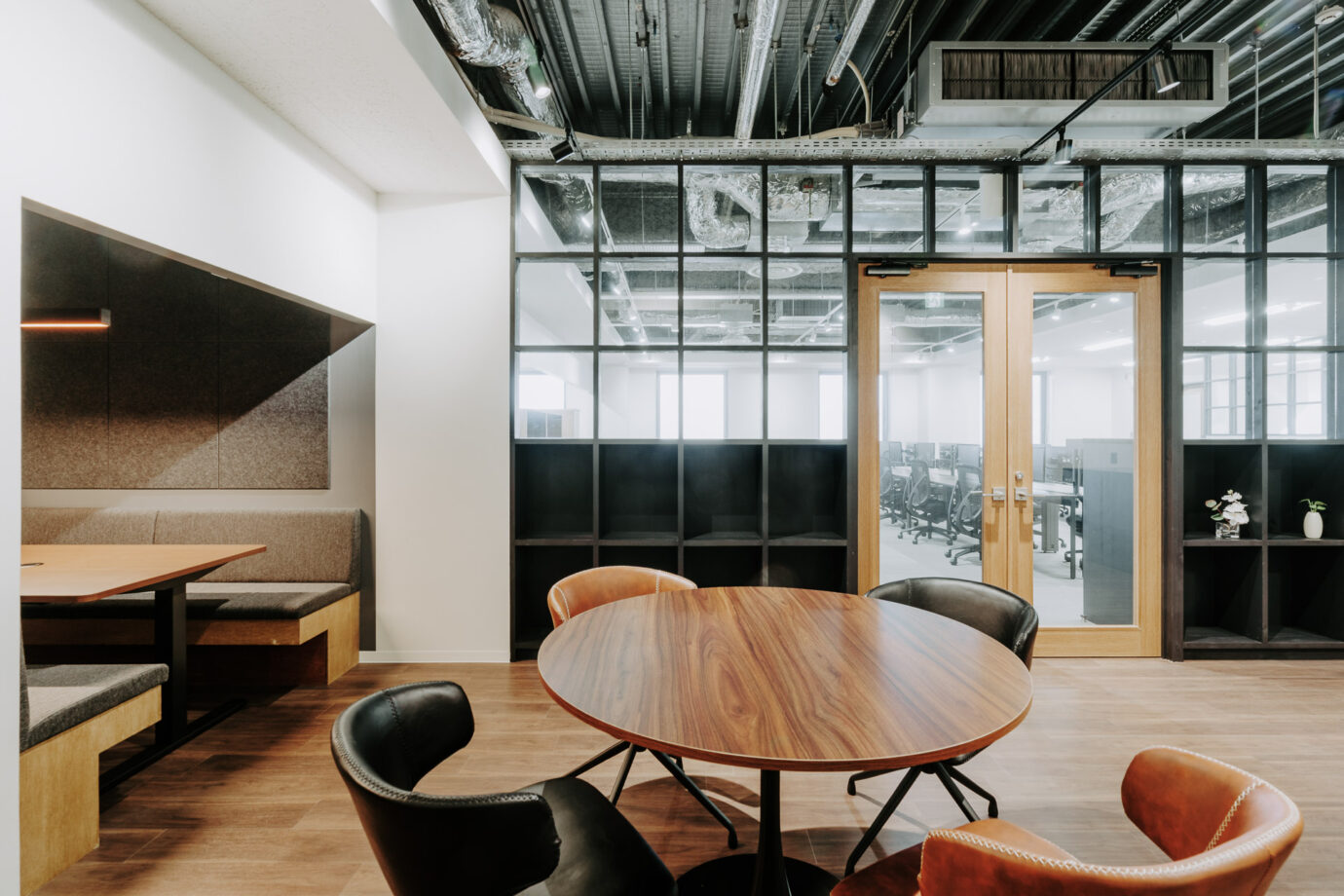 エイトデザイン:執務室とラウンジを分けましたが、その仕切りは格子窓なので、ラウンジに居ても執務室が見えますし、視界は繋がっています。以前は閉鎖的な間取りだったという社長室や管理室にもガラス窓を設けて、中で働く人の姿が目に入るようになりました。